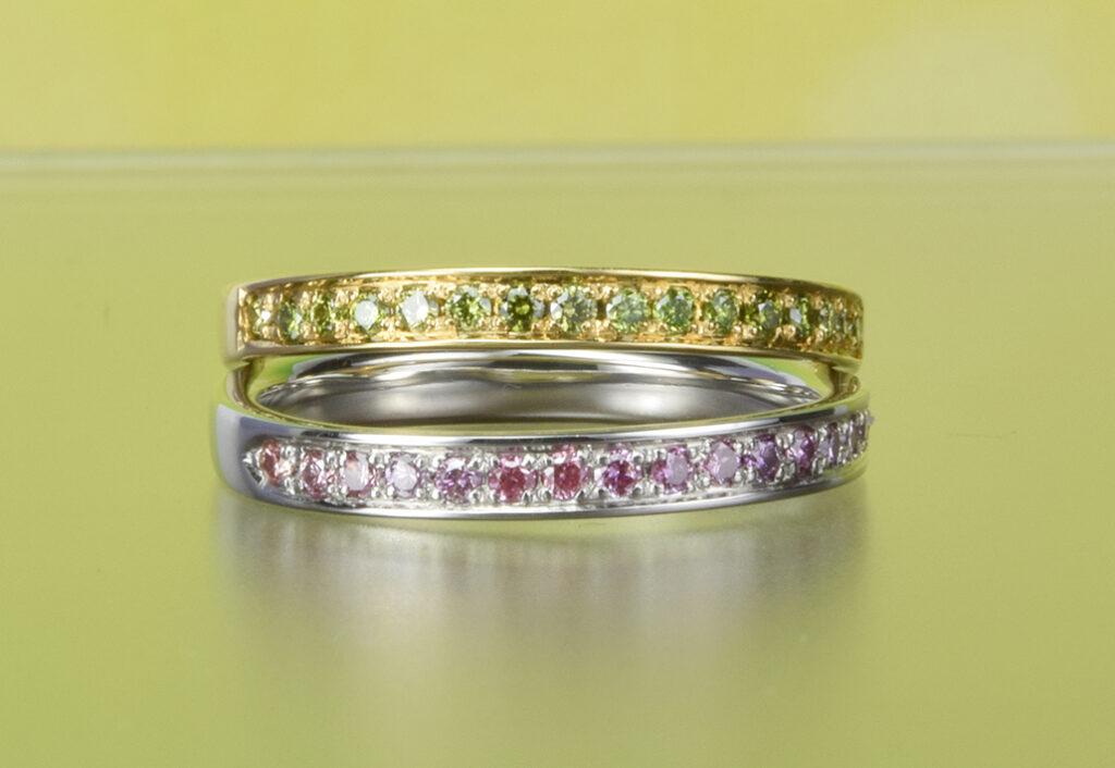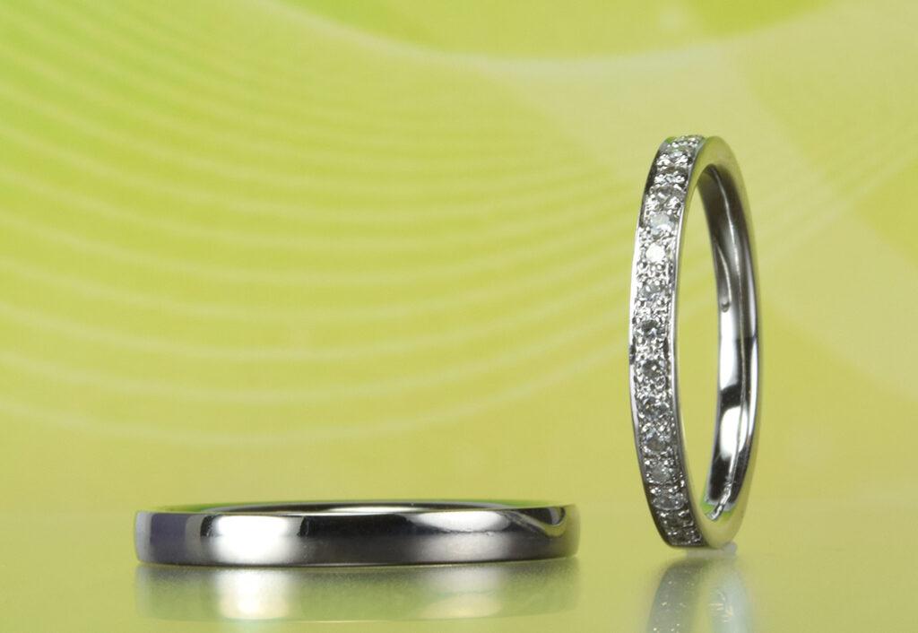 結婚指輪と同じくダイヤが並んだエンゲージリング&マリッジリングが作れる。