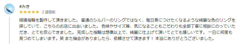 結婚指輪を製作して頂きました。 普通のシルバーのリングではなく、毎日身につけたくなるような綺麗な色のリングを探していて、