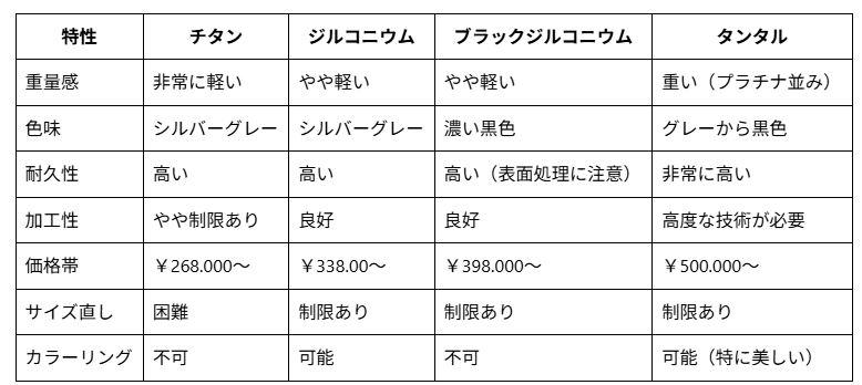 金属アレルギー対応の婚約指輪に使用される4種類のレアメタルには、それぞれ異なる特徴があります。あなたの好みや予算に合わせて選べるよう、詳しく解説します。