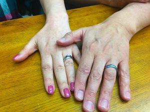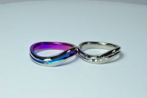 メンズはカラーリングで個性的にそしてレディースは右肩上がりに意味ある石を入れ輝く結婚指輪になりました。