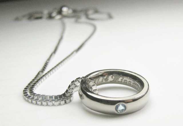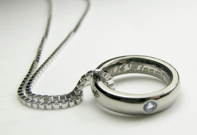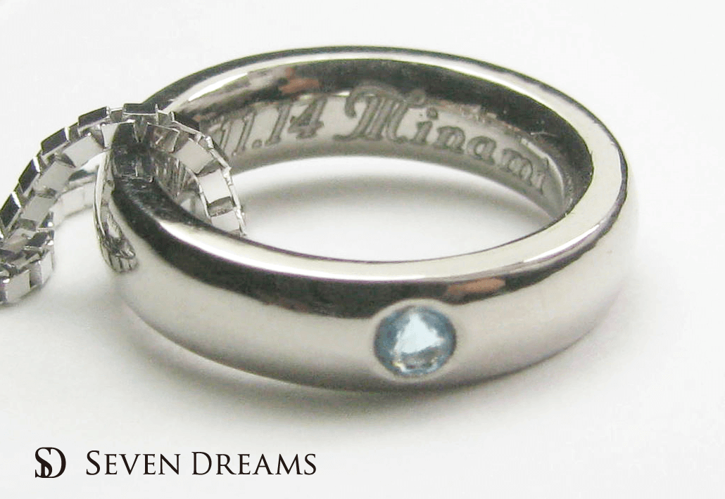 リングには幸せを導く誕生石を埋め込みリングの内側には、生年月日・名前を彫り込みました。