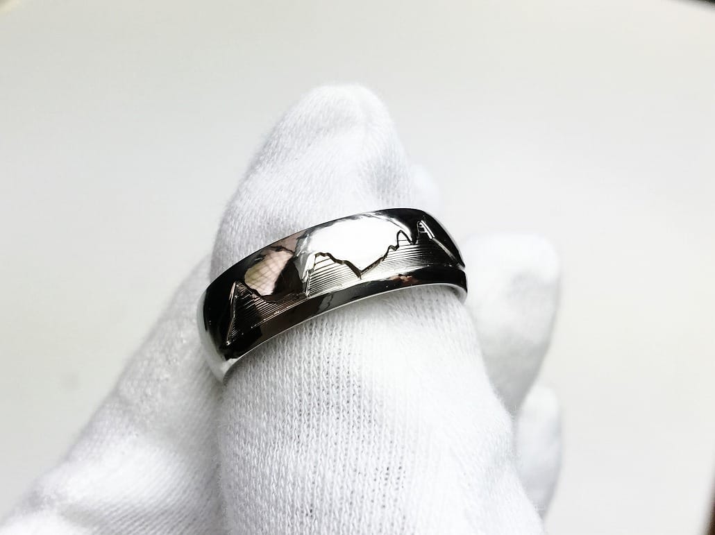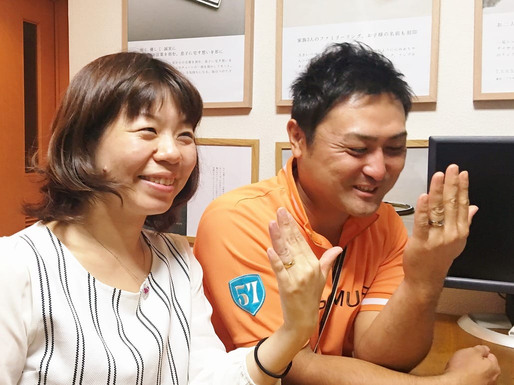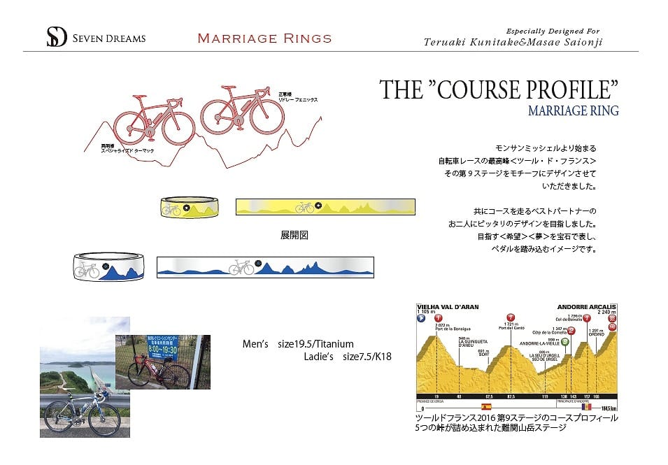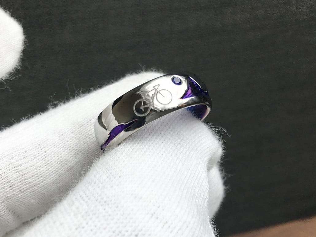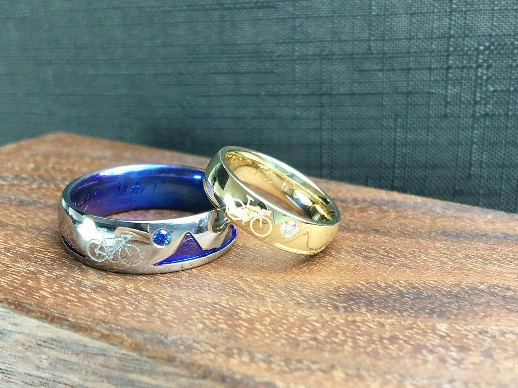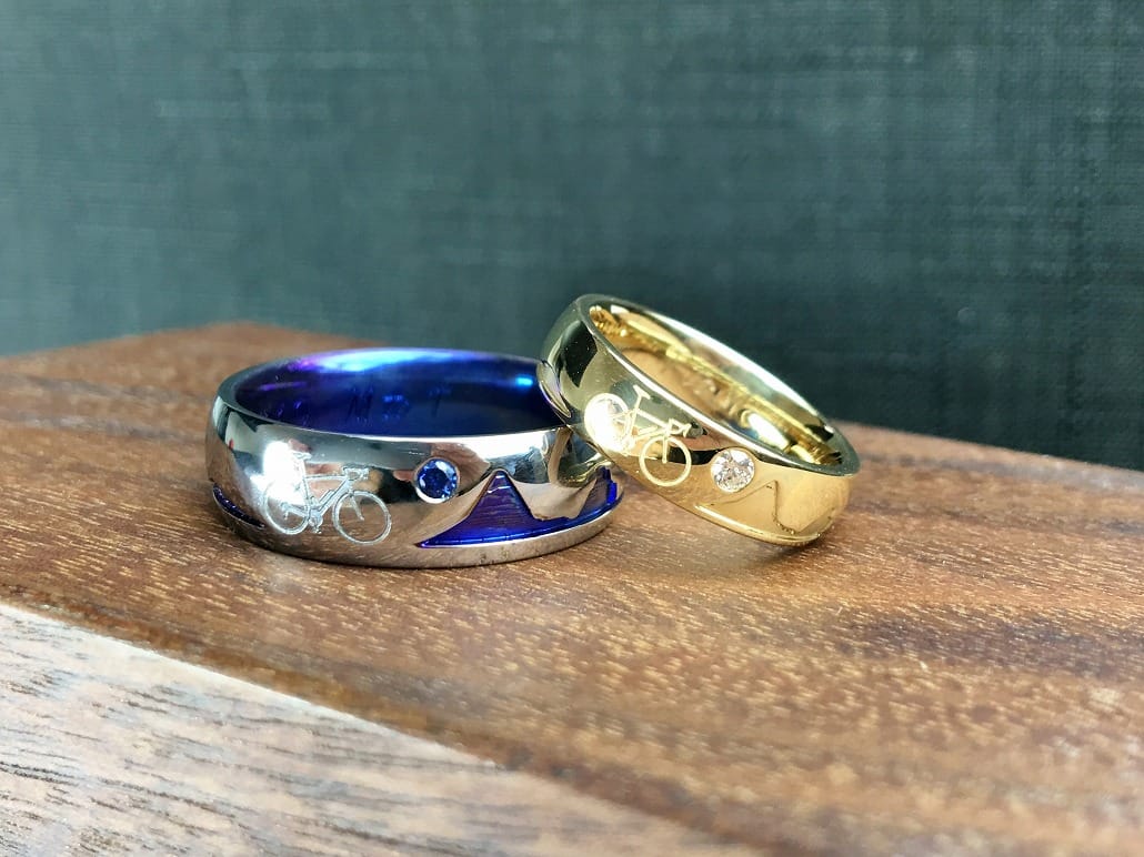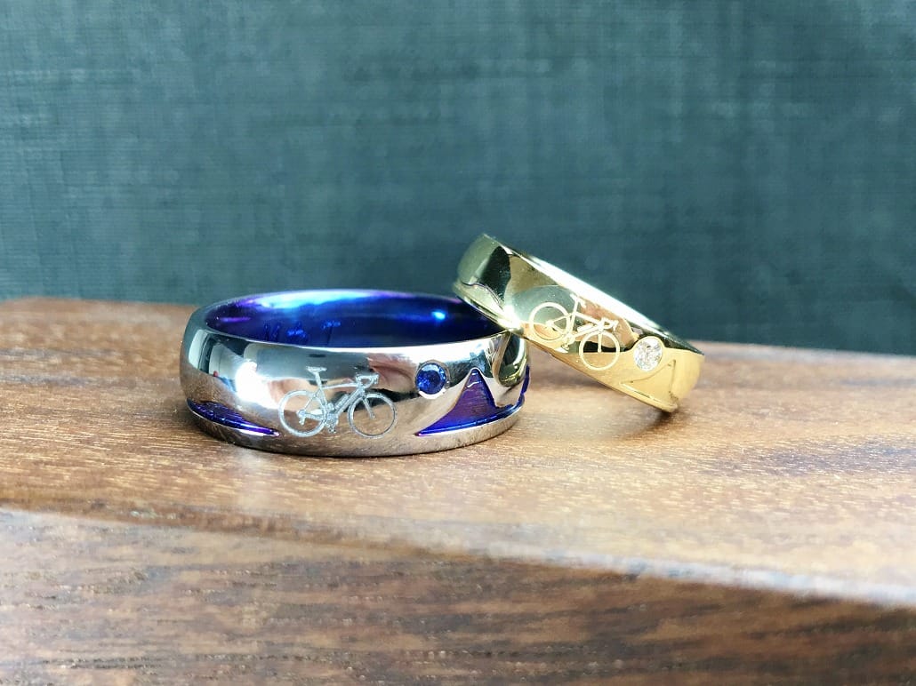 オリジナル結婚指輪(純チタン,k18)共通の趣味ロードバイクをリングに