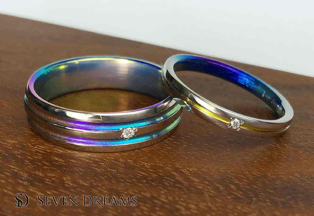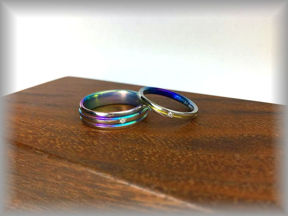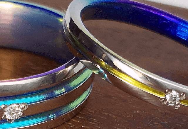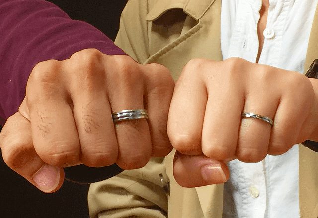 バイクが好きでバイクの焼き色を結婚指輪で表現しました。彼女は彼の好きな指輪だったら何でもいいと言われ同じラインの結婚指輪に決定されました。