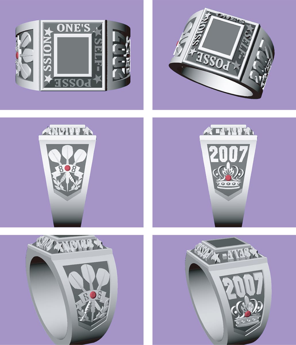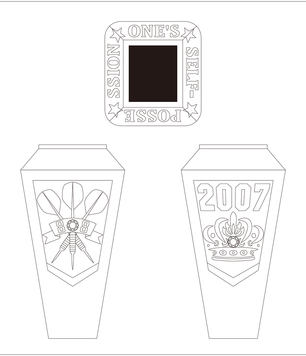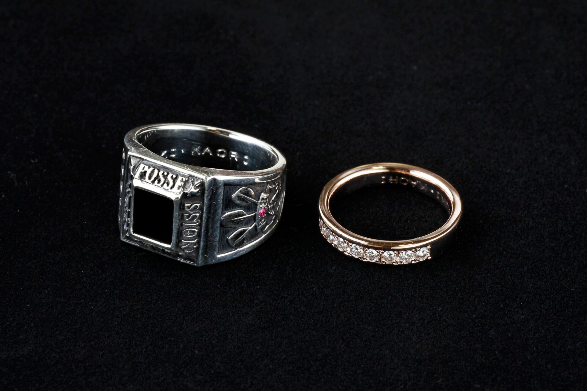 御新郎はダーツ競技のプロフェッショナルでチャンピオン。座右の銘<POSSESION>をチャンピオンリングスタイルのオニキスの周囲に浮き彫りに、サイドパネルには三本のダーツの矢をあしらって。ご新婦様はピンクゴールドのエタニティータイプでエレガントに