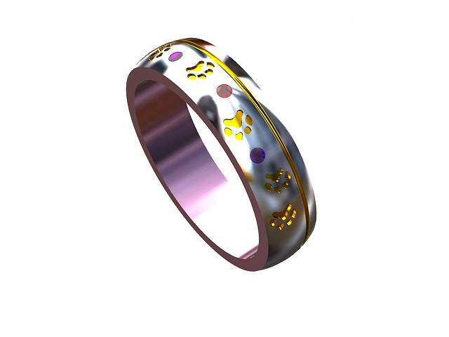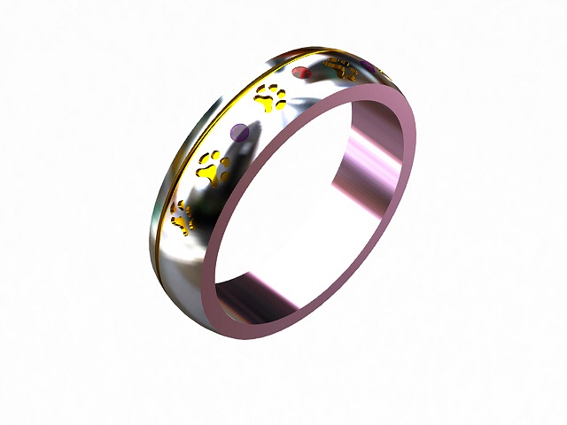「愛犬の肉球を入れた結婚指輪を作りたいんですがそんな事が出来ますか?」と大分からご来店頂きました。お話しをしっかり聞かせていただき実際に愛犬の肉球を画像で送っていただきスキャンして彫り込む方向で決定。愛犬の毛の色をピンクゴールドとチタンのゴールドのカラーリングで表現することに。宝石は愛犬と二人の誕生石をちりばめて。まずはリングのCGをお創りして、画面上でぐるぐるうごかした動画を添えてご確認を。