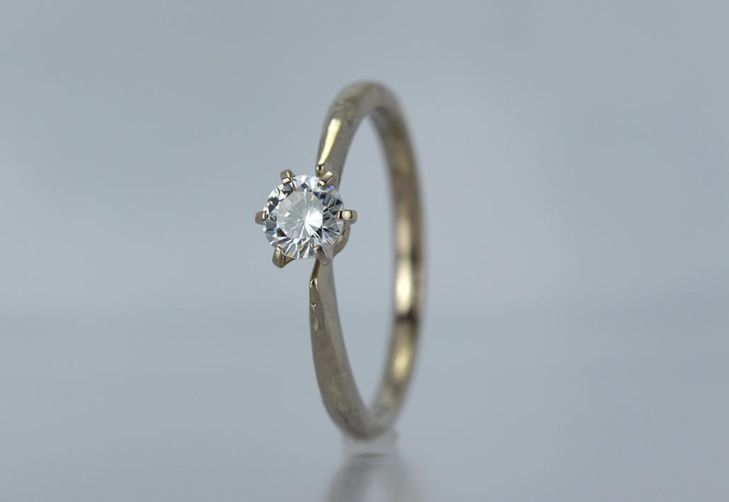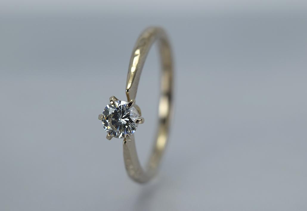 シックでおさえめのシャンパン色の色合いで、人気獲得中の<シャンパンゴールド>と、クラフト感が人気のつち目をアームに施した婚約指輪です。