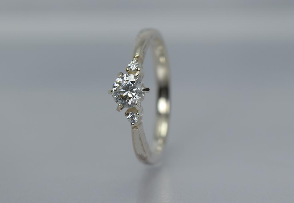 王道の六本爪エンゲージの両サイドにメレ(小粒石)をあしらったキュートなデザイン。