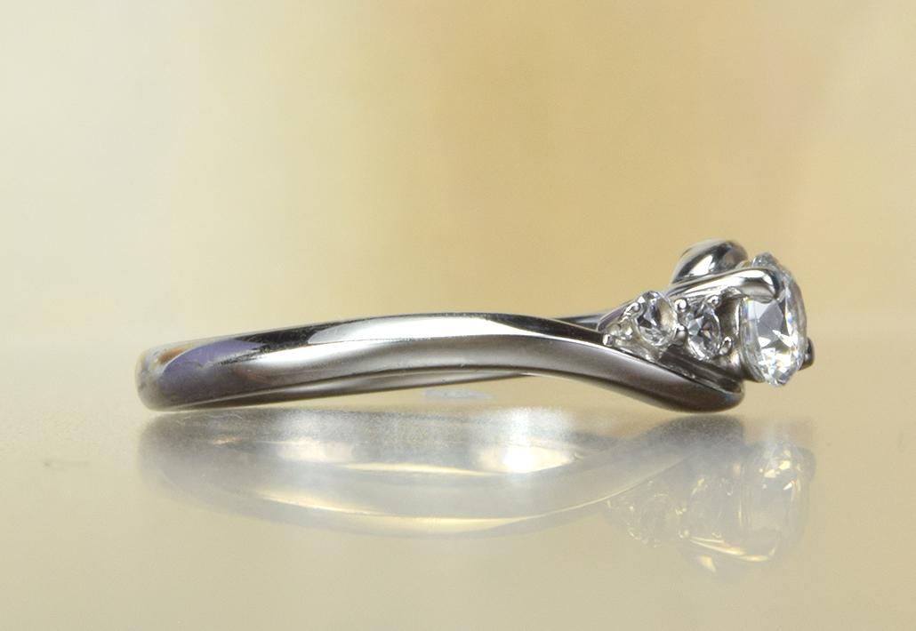 カーブを描くアームに寄り添うようなメレダイヤ(小粒のダイヤ)が花嫁の指を美しく演出します。