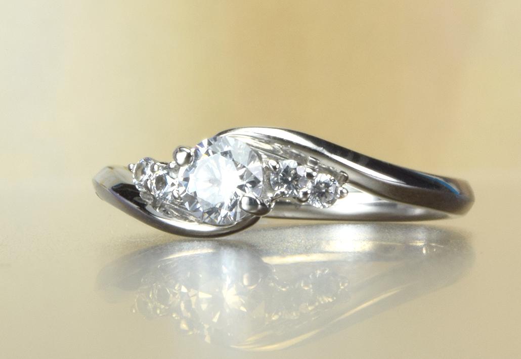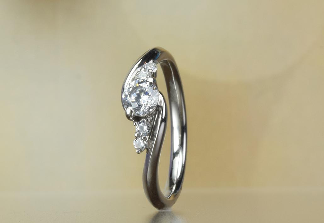 金属アレルギー対応のハフニウム婚約指輪|人気のさりげないボリューム感の|スクロール4ストーン