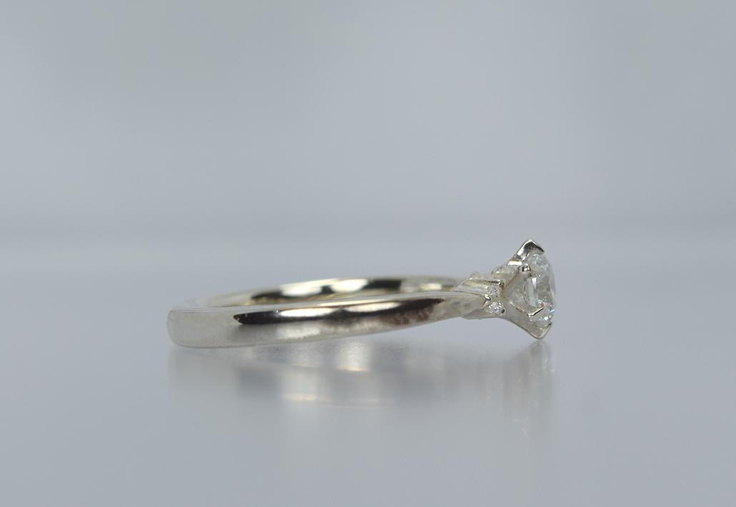 王道の六本爪エンゲージの両サイドにメレ(小粒石)をあしらったキュートなデザイン。