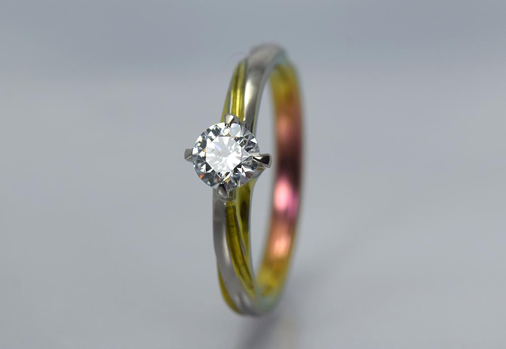 プラチナの白色、ゴールドのイエローだけだった婚約指輪の世界に、虹のような、多彩な色合いをもたらしました。