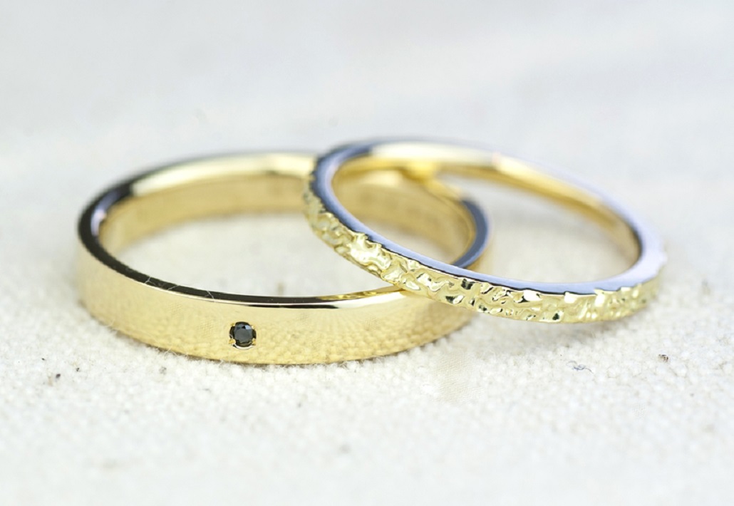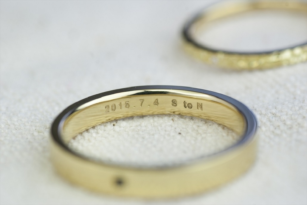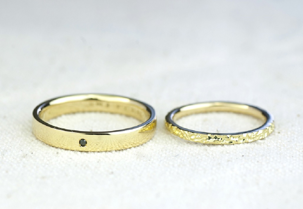 レディースはセブンドリームス始まって以来、最も選ばれた人気テクスチュア<アース>をイエローゴールドで素材のカスタマイズ。メンズはプレーンなフラットのフレームに、ワンポイント・ブラックダイヤ。