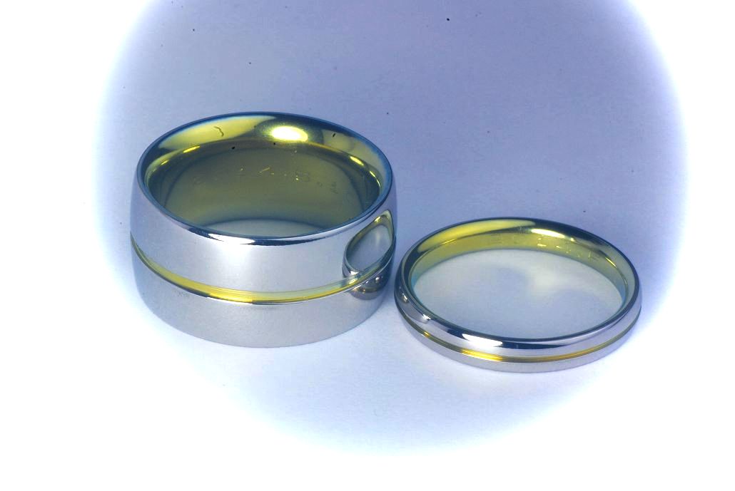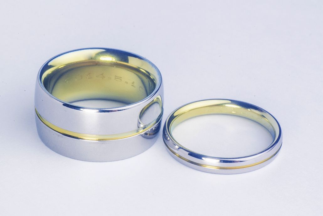 アメリカに在住の日本人の彼の職業がデザイナーでした。一時帰国した時に日本で結婚指輪を購入しようと当社を選んで頂きました。太ければ太い指輪をご希望されて10mmの指輪に決められました。お二人のセンターラインはゴールドラインでペア感を現しました。