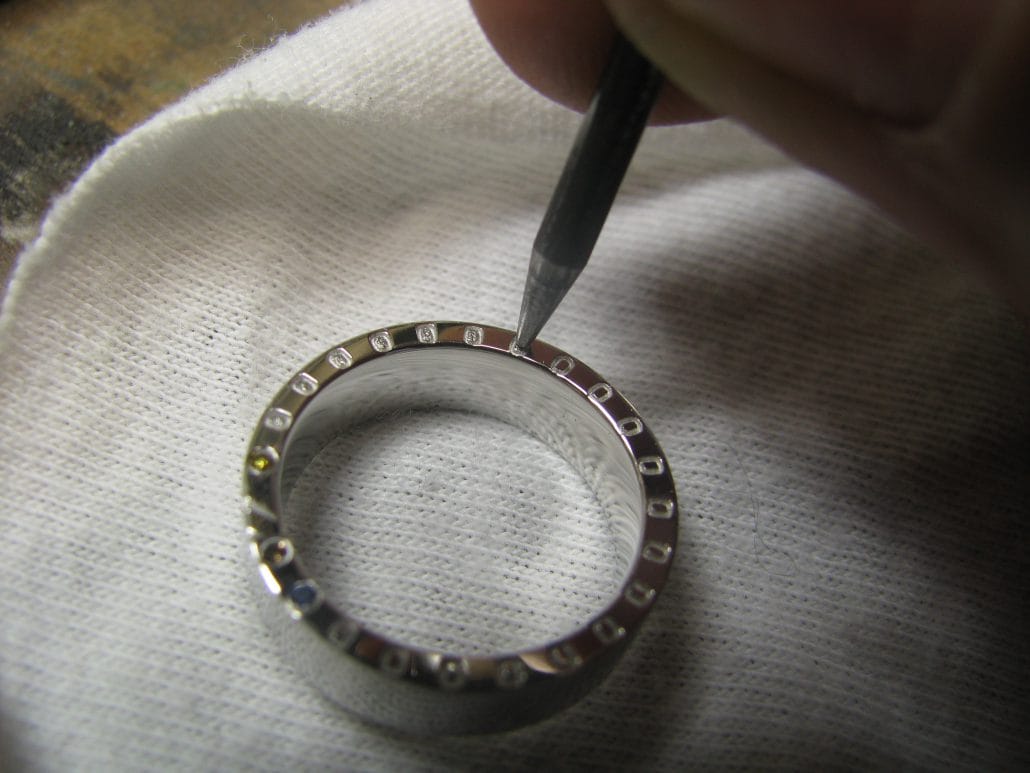 様々な国をめぐる日々を、側面にぐるりと地球儀の<経度>のメモリを打ち込んで表現。2本が合体すると、その上を飛ぶジェットが現れるシークレットなこだわりリングに仕上がりました!