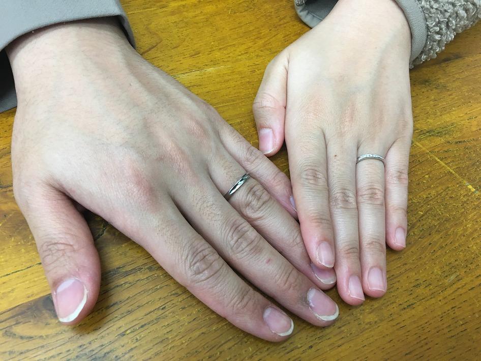 お仕事柄重たい荷物を持つのでメンズは曲がらない結婚指輪を選びました。O-MA-370