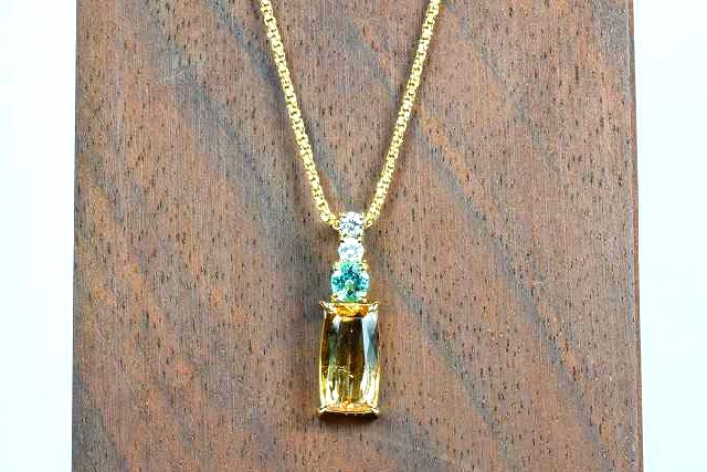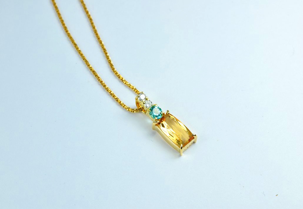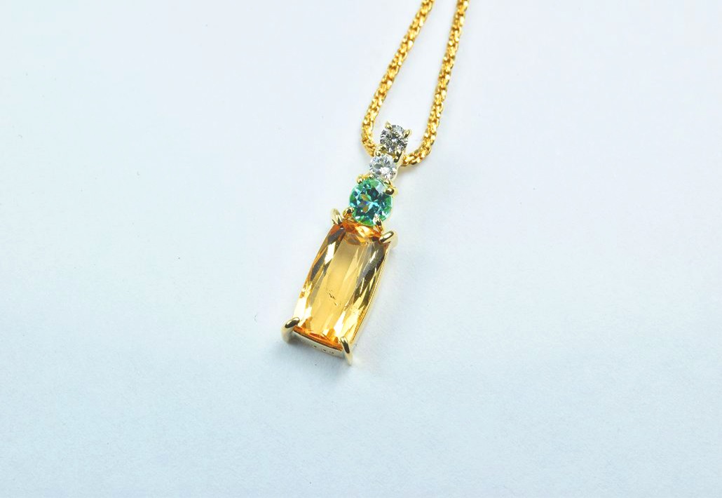 せっかくなのでペンダントでしたいというご希望。自分のラッキカラーが青と黄色なので1つインペリアルトパーズと足してペンダントを一緒にデザインしました。満足な逸品となり大変喜ばれました。