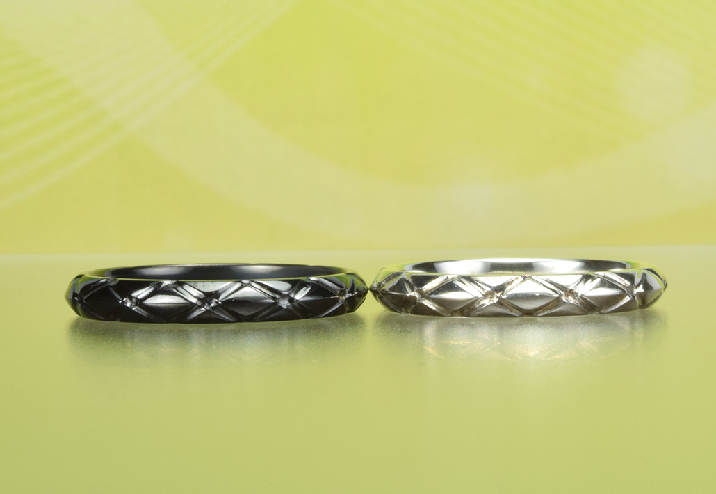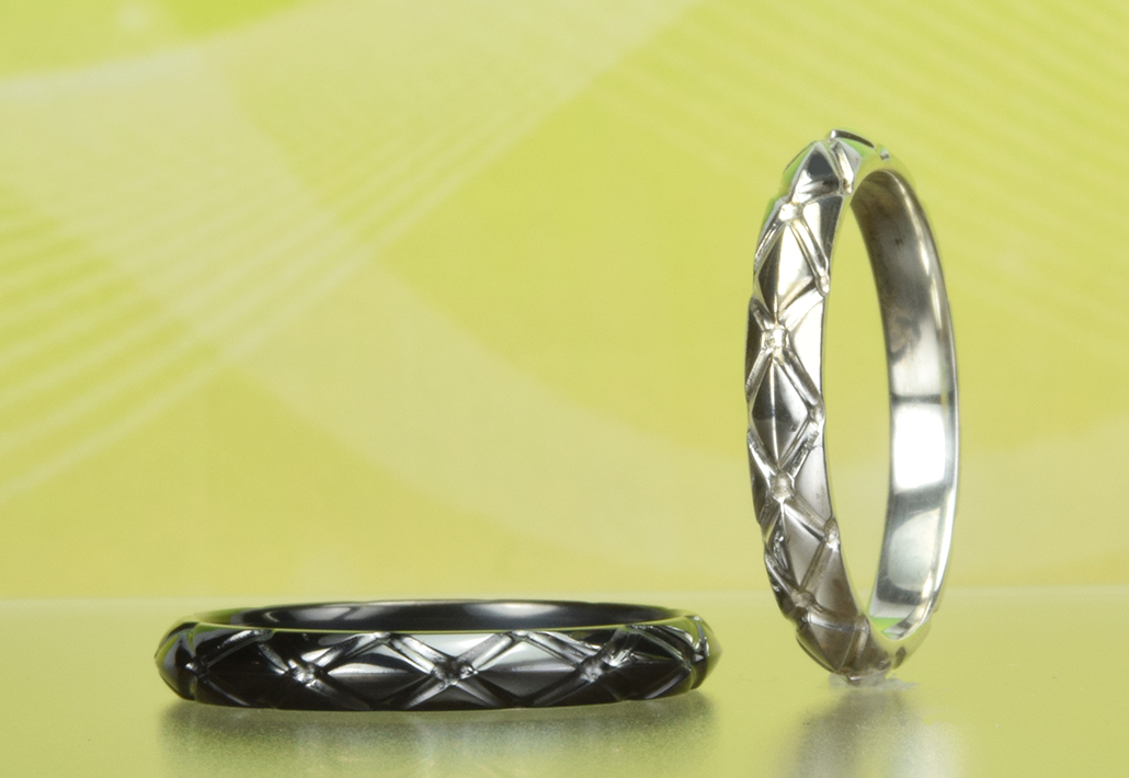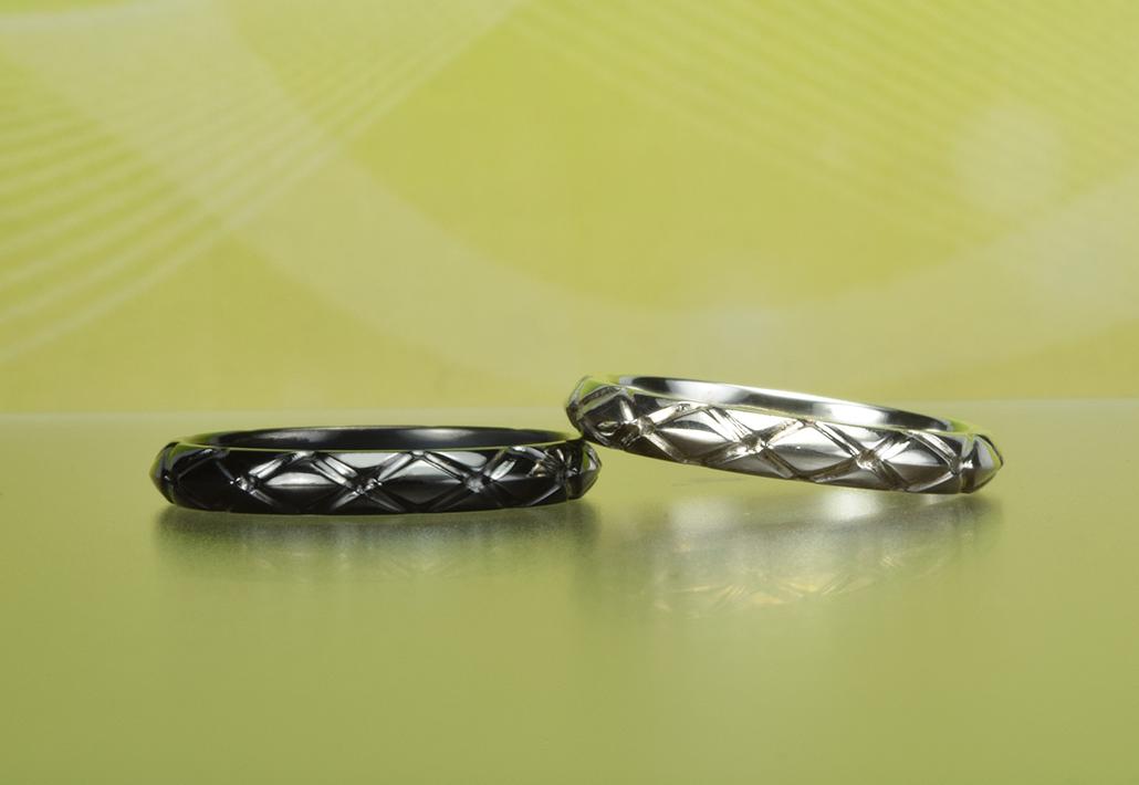 黒の結婚指輪 金属アレルギー対応 縁起柄ラスターアーガイルスリム ブラック&ホワイト【MG-074】