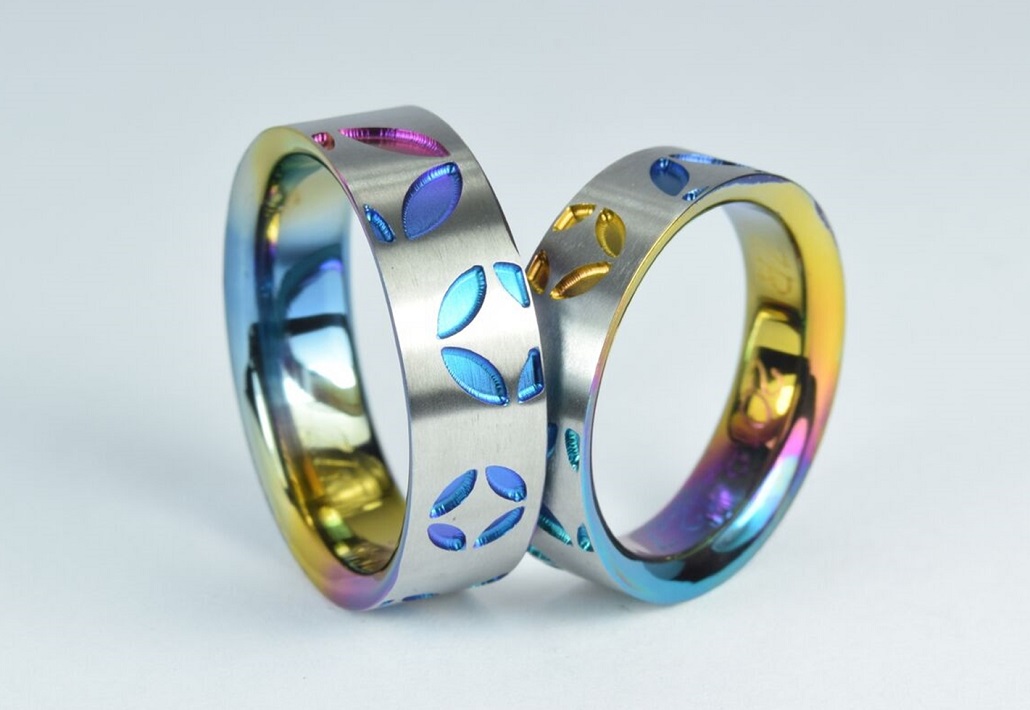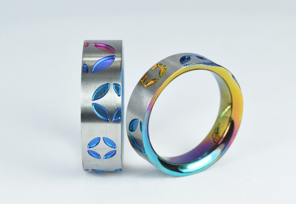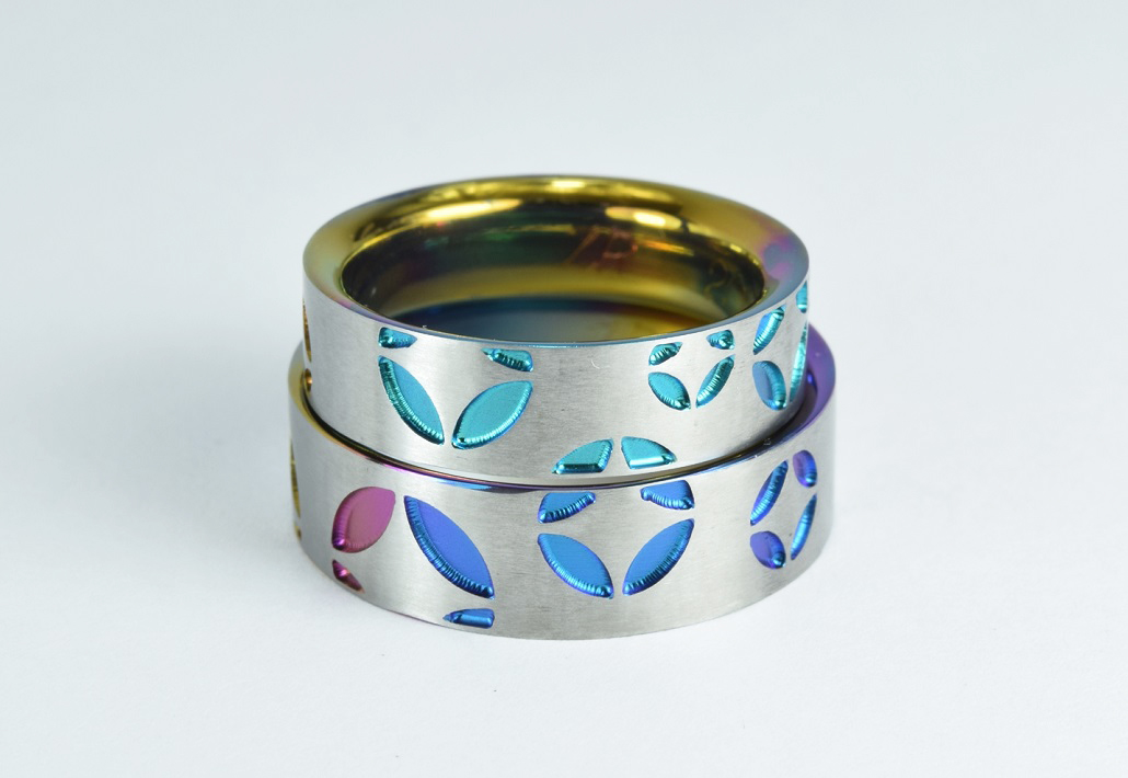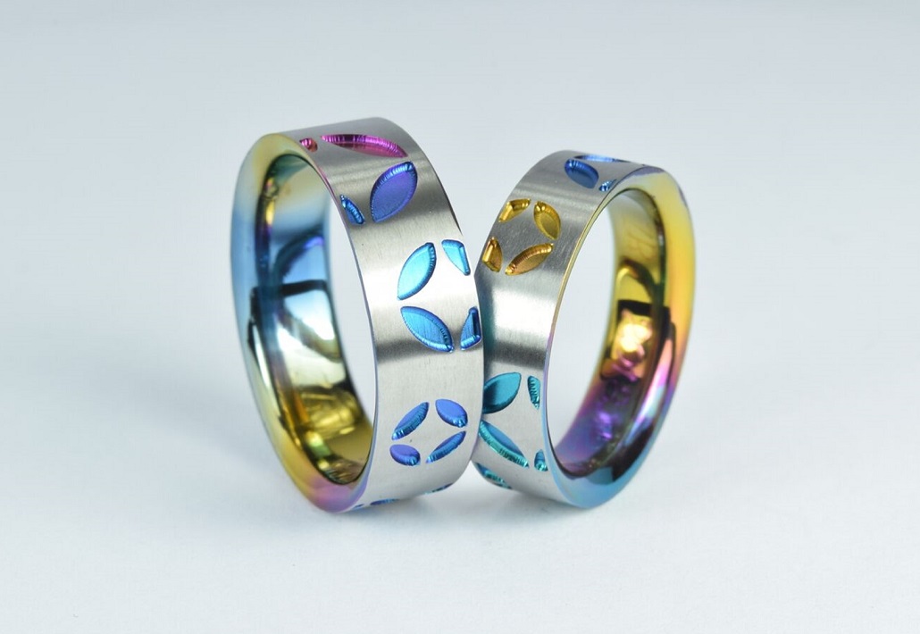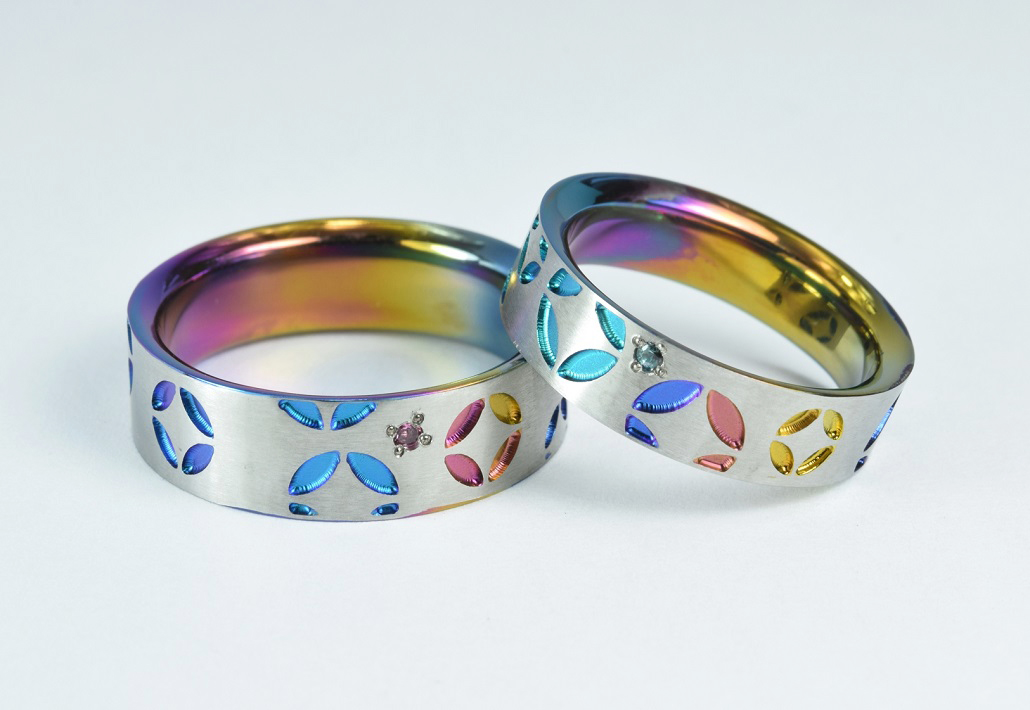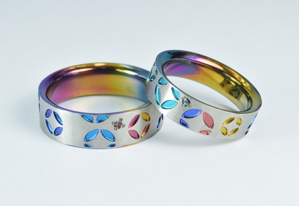 カラーリングは120色のグラデーションです。いつも感じるのですが日本の技術の正確さはすごいと思います。色はメッキではなく、電圧を自由自在に変化させることで発色しています。チタンとジルコニュウムで迷われましたが最終的にはジルコニュウムを。ジルコニュウムは特に発色がきれいで魅了されます。レアメタルならではの特別感と上品さが魅力的。お二人の幸せを心から祈っております。