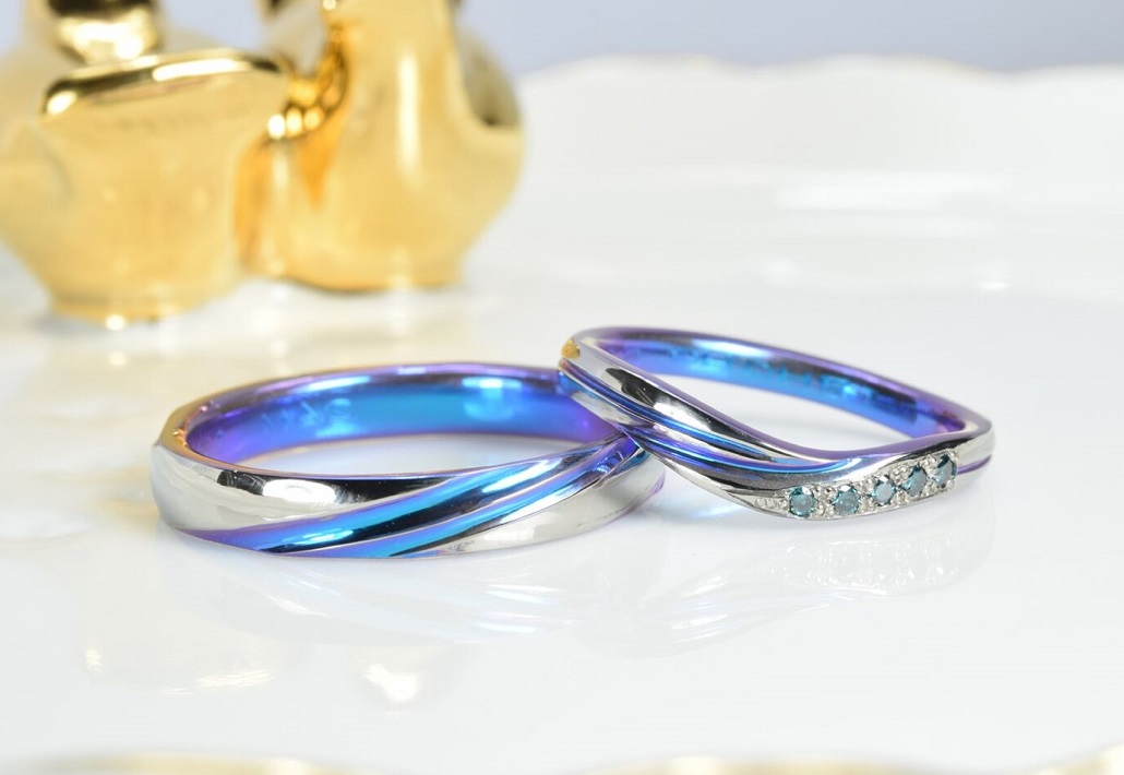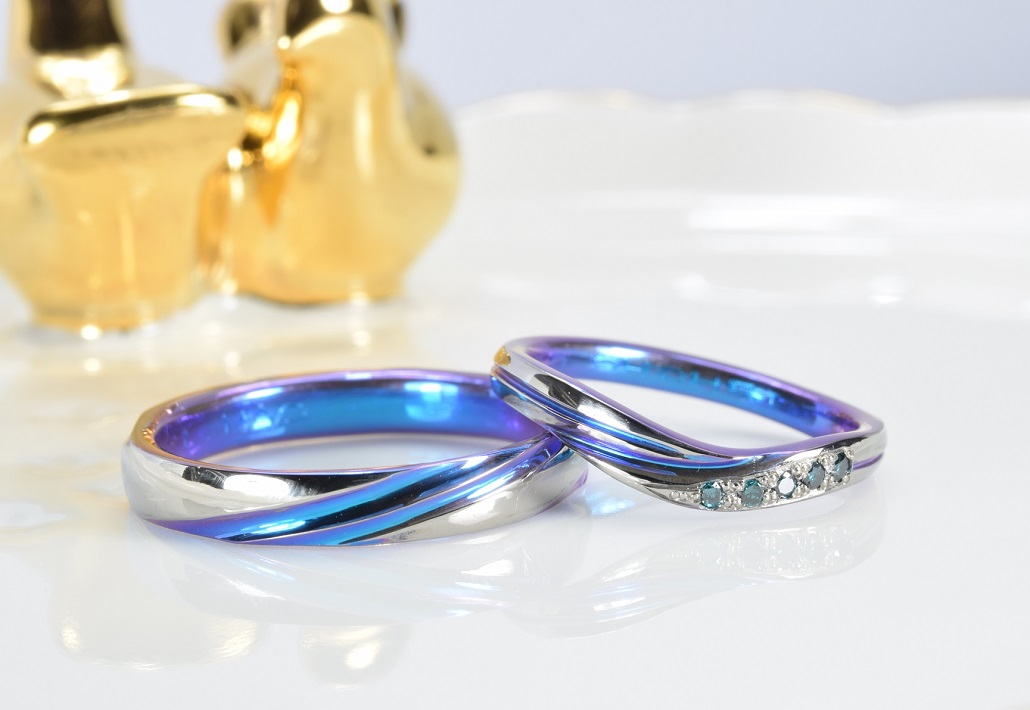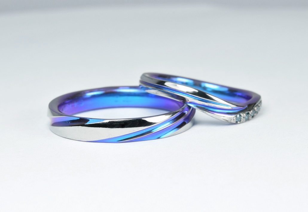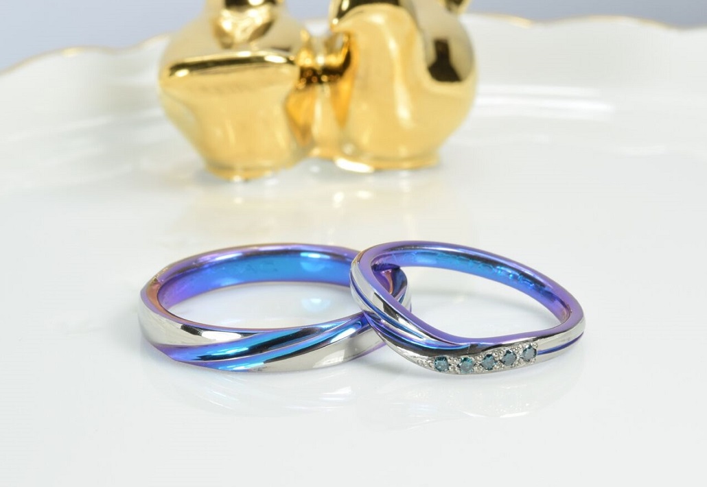 何件か違うお店でも検討をして完成した結婚指輪。ブルーダイヤモンドもとても個性的で、しかもウエーブラインがとても可愛い。メンズはストレートのリングにトルネードの模様を入れスピード感があふれるリング。軽くて強いチタン製を選びました。