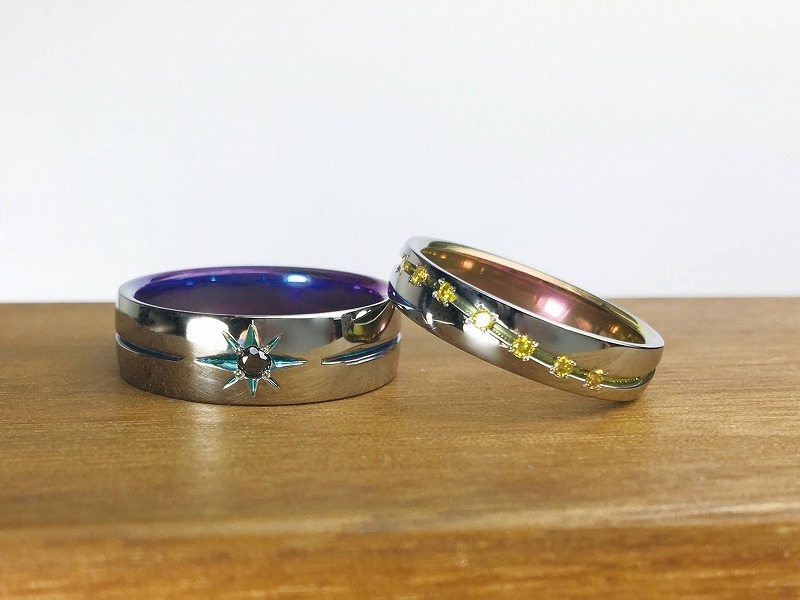 メンズは<五光留め>という伝統ある彫金技法で星のきらめきを彫りこんであります。タガネで彫り込んだ<スパークル>をチタンならではのカラーリングで鮮やかに発色。五光留め+カラーリングは多分他に例が無いレアな仕上がりです。レディースはイエローのラインにイエローダイヤを連ね、金色の輝きがぐるりとリングを取り巻くゴージャスなイメージ。仕上がりにお二人から喜びの言葉頂いた後、「この店わたしが見つけたんだよね~」とご新婦様のお手柄アピールが。出会いに喜んでいただいて嬉しい限りの御納品でした!
