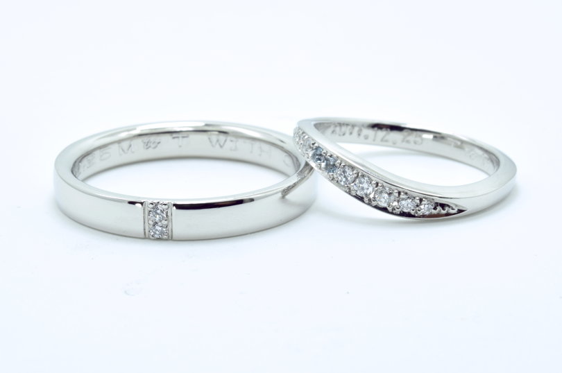 最終的には彼女はアクアマリンの石を2個入れて彼もダイヤモンドを入れた結婚指輪に決定されました。オーダーメイドが高いと思っていたけど自由にカスタマイズできるし今では安いと感じています。とお二人がおっしゃいました。