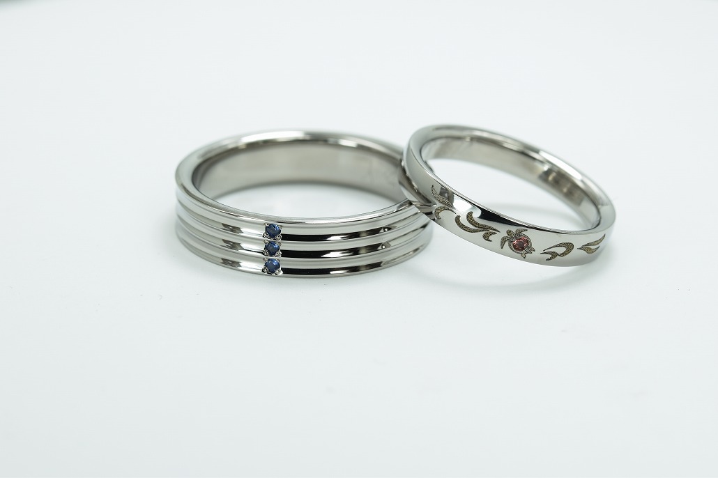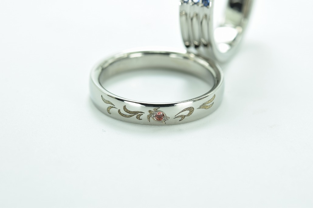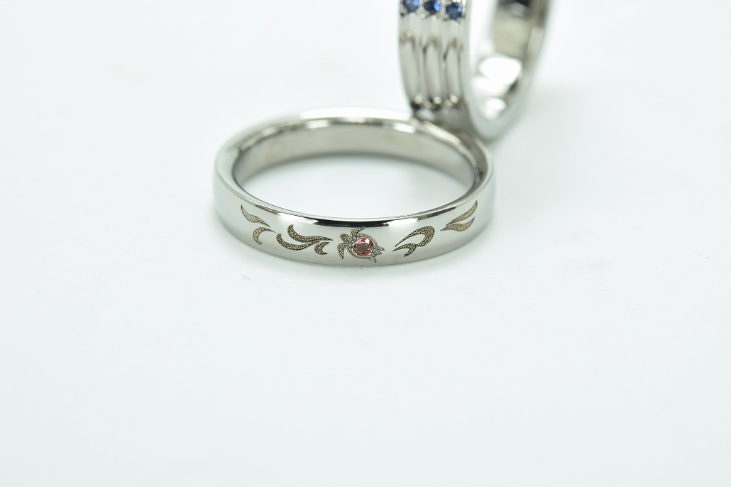 「ピアスでアレルギーを発症して以来、指輪が着けられない…」というご相談から生まれた、純チタンのマリッジリング。ハワイで“幸せを運ぶ”といわれるホヌ(ウミガメ)をレーザー刻印し、サファイアとガーネットをあしらいました。