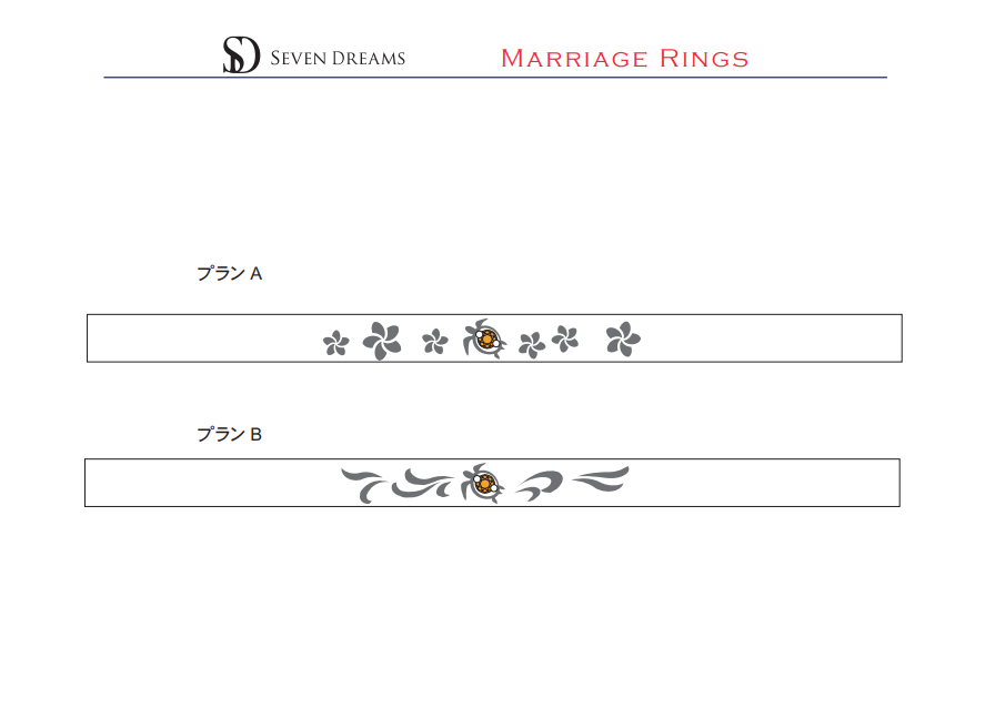 奥様のリングには、ハワイで幸福の象徴とされるホヌ(ウミガメ)モチーフをレーザーで繊細に彫刻。サンプルを2案ご提案し、上品で可憐な唐草と組み合わせたデザインに決定しました。
