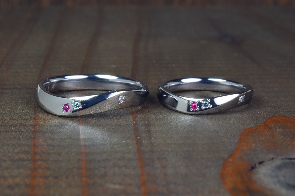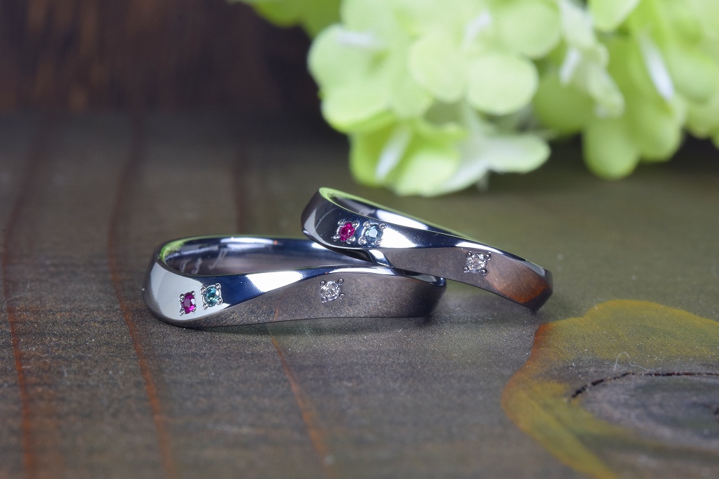 お互いの仕事の時間帯が違うので一緒に住んでいるのですが同じ時間を共有することが今の所少ないのです。そこでお互いの誕生石を入れる事でいつも一緒にいる感じになれたらと思いました。1粒ダイヤモンドを入れて頂いたのは、ダイヤは太陽をイメージして二人を照らしてくれているイメージです。