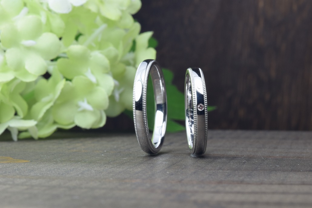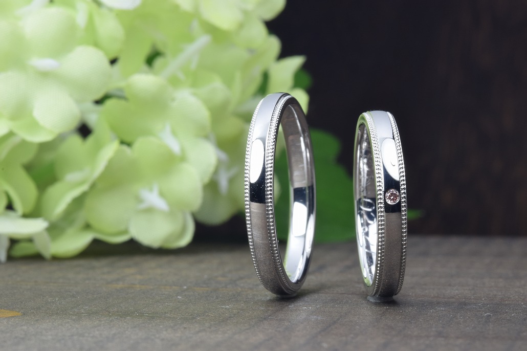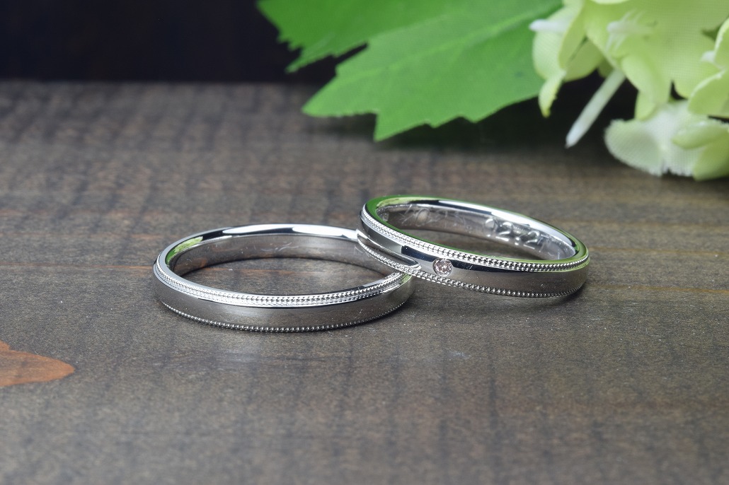 ミル打ちの技術もありますのでとても繊細に美しく入れる事が出来ます。彼のこだわりで18ホワイトゴールドでミル打ち&ピンクダイヤモンドの結婚指輪にご決定頂きました。