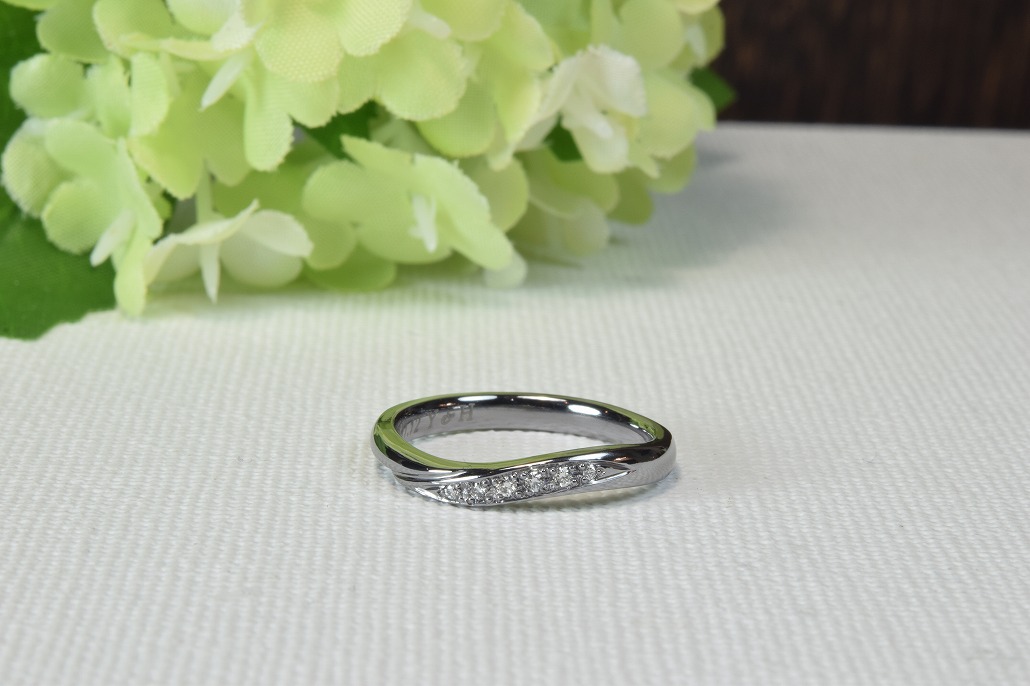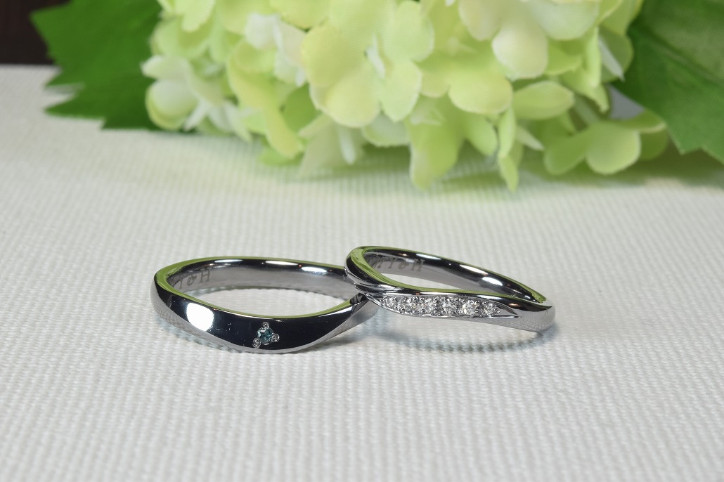 お二人ともタンタルの結婚指輪で決定されました。お二人ともウエーブのデザインで彼女はダイヤモンドを5つ入れる事になりブラックに透明感のあるダイヤモンドはとても高級感があり画像でのご提案でしたがとても気に入っていただけました。