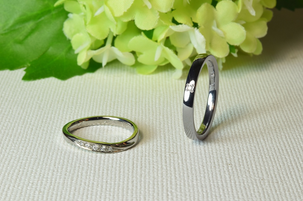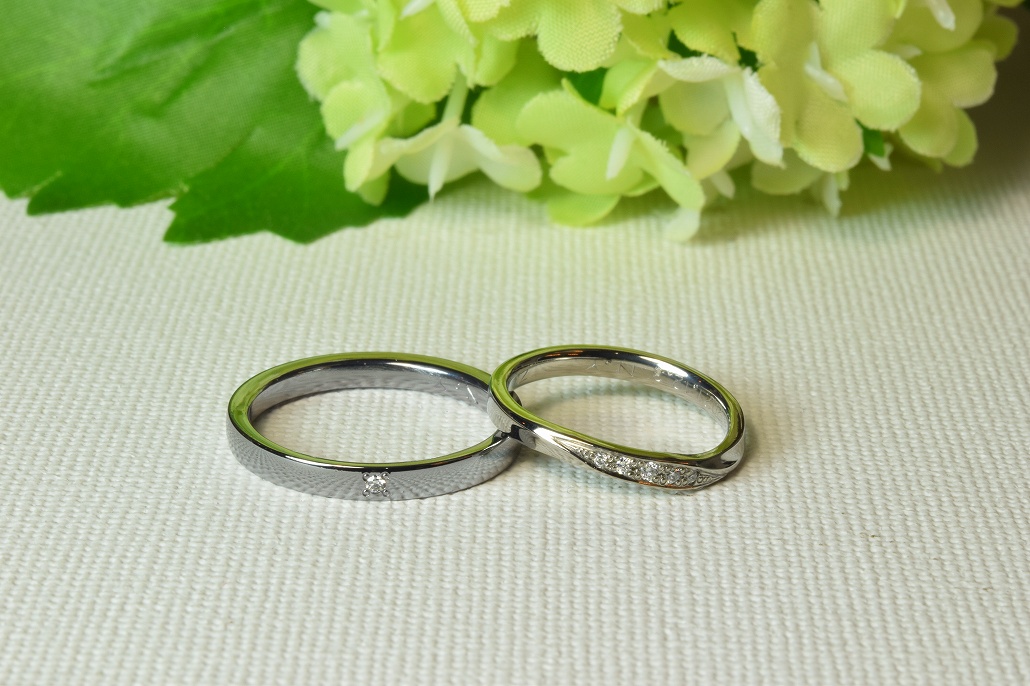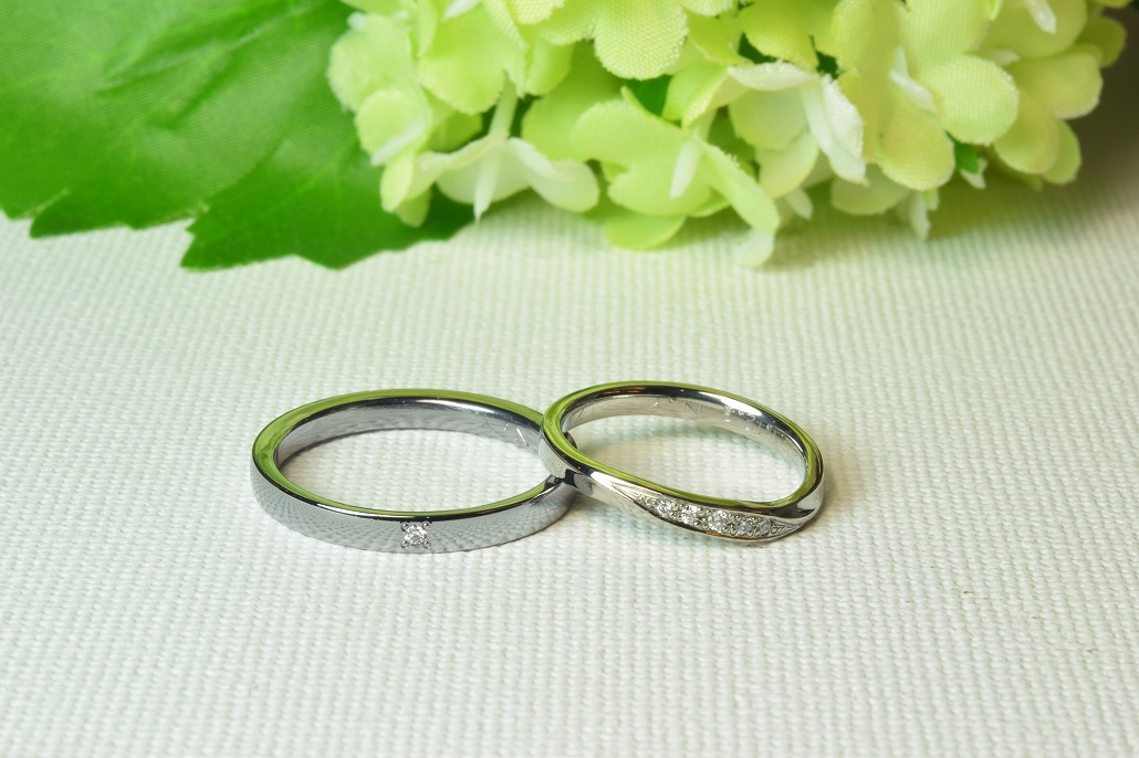 彼は黒の結婚指輪で人気のタンタル素材で彼女はジルコニウムでダイヤモンドが5個入る結婚指輪を気に入られました。はじめは石は入れる予定はなかったようですがやはり実物を見ると気が変わります。キラキラと輝くので見ていて飽きが来ません。