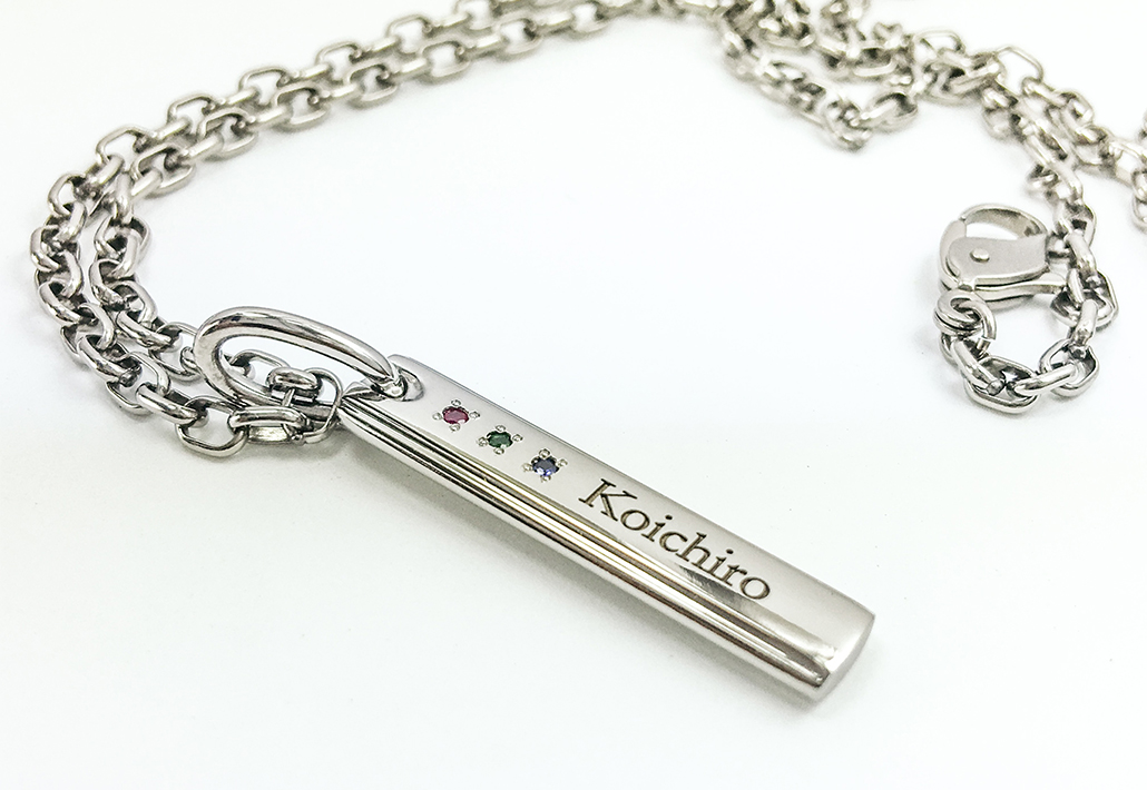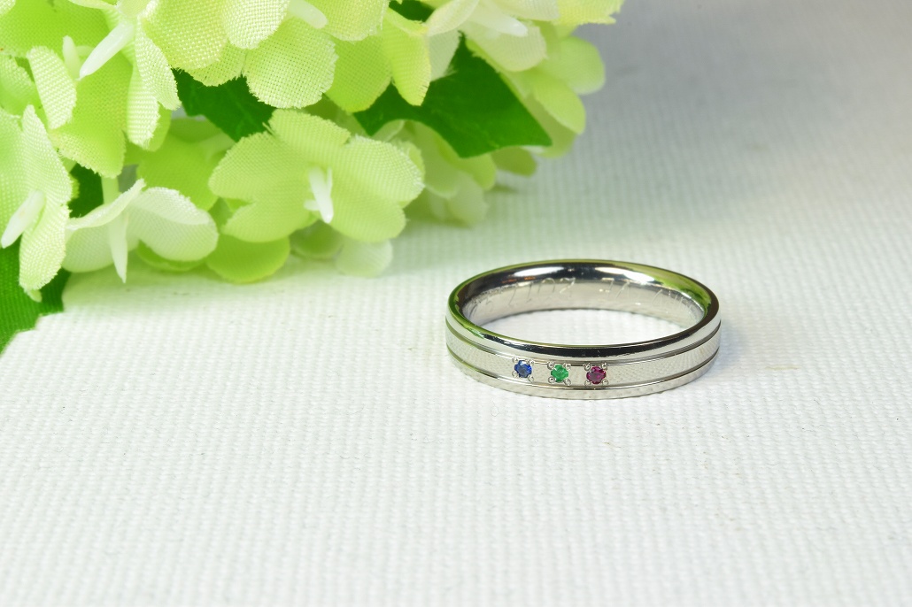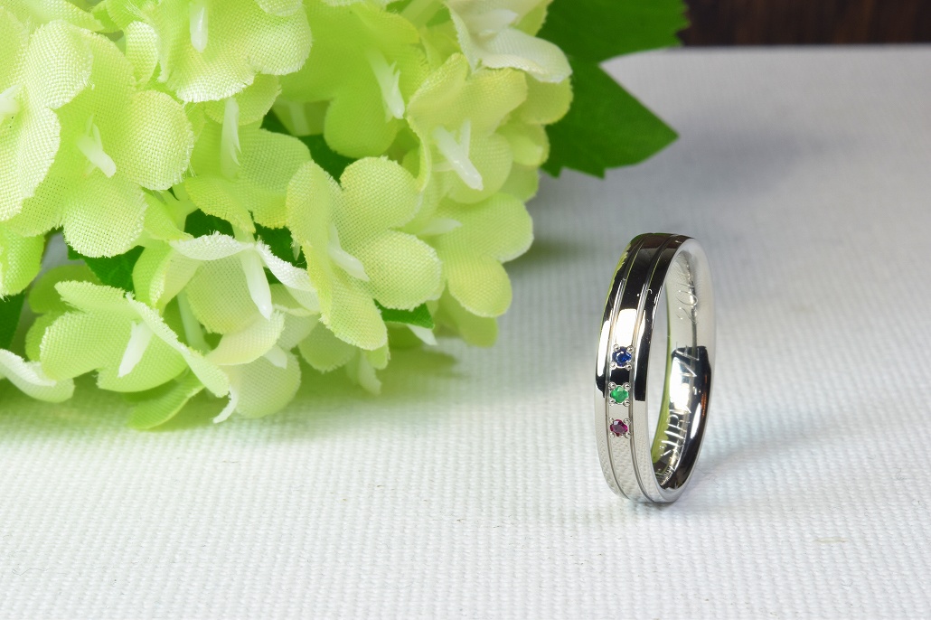 誕生石は5月緑色のエメラルド7月赤色のルビー9月青色のサファイアと色の3原色と強くて艶やかな色合いとなりました。奥様はピンクゴールドとプラチナのコンビでご主人様は軽くて強い純チタンの素材を希望されました。そして息子さんには純チタン製のIDプレートを製作することになりました。