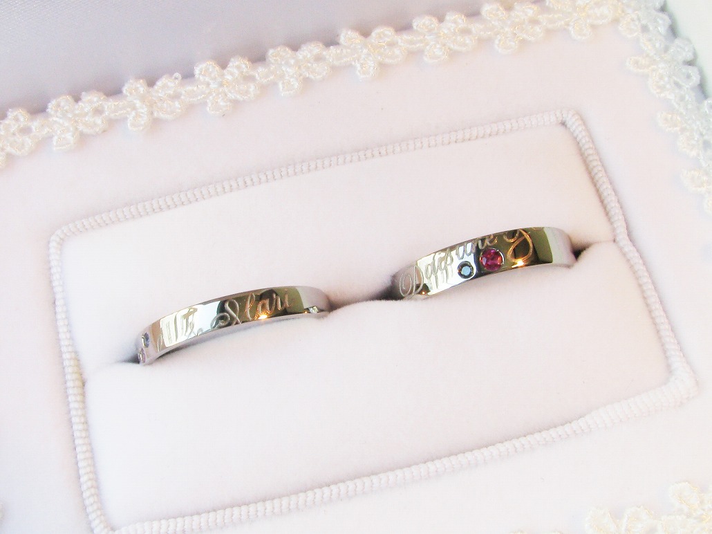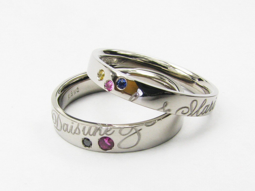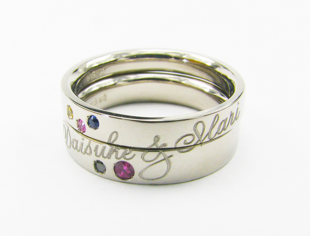 大分からご来店のお二人にお創りした、二本が合体することでお二人のネームが完成する一体感あるデザインのマリッジリングです。筆記体の文字を斜めにして上下に分割して2本のリングにいれてあるので、一見唐草模様風のデザイン?という感じですが、2本あわせると写真のようにネームが完成します。踊るような書体の文字にあわせて、カラーストーンを散りばめてリズミカルな華やかな雰囲気に。