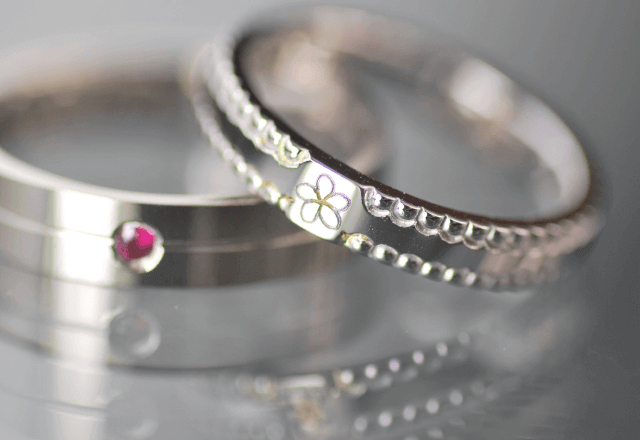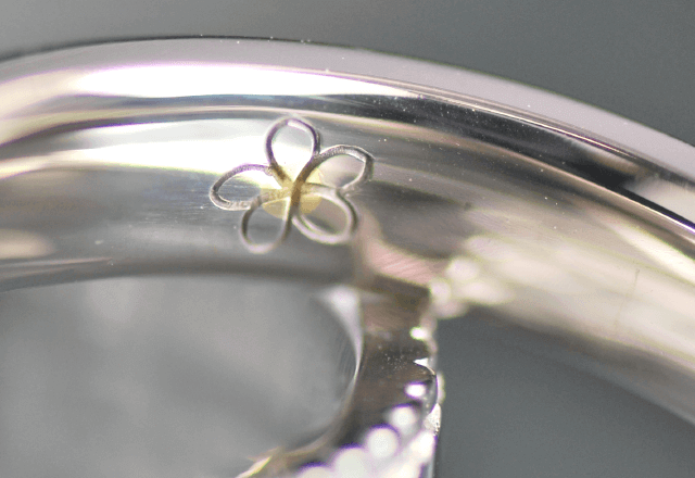 ハワイの女性が髪に飾る花といえばプルメリア。首にかけるレイにも使われる人気の花はご新婦様のお気に入り。レディースは正面に、メンズは内側に彫り込むことになりました・・が!本当のこだわりはこ・こ・か・ら!花の中心からイエローが真っ白に変化するグラデーションをリングで表現したいというご希望。小さいゴールドの粒を溶接し平らにならした上からプルメリアのデザインを彫刻。リングの上に咲いた見事なプルメリアに大満足頂きました!