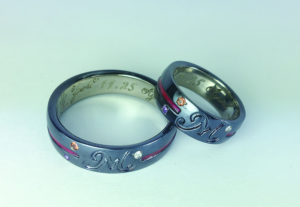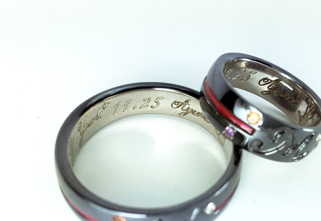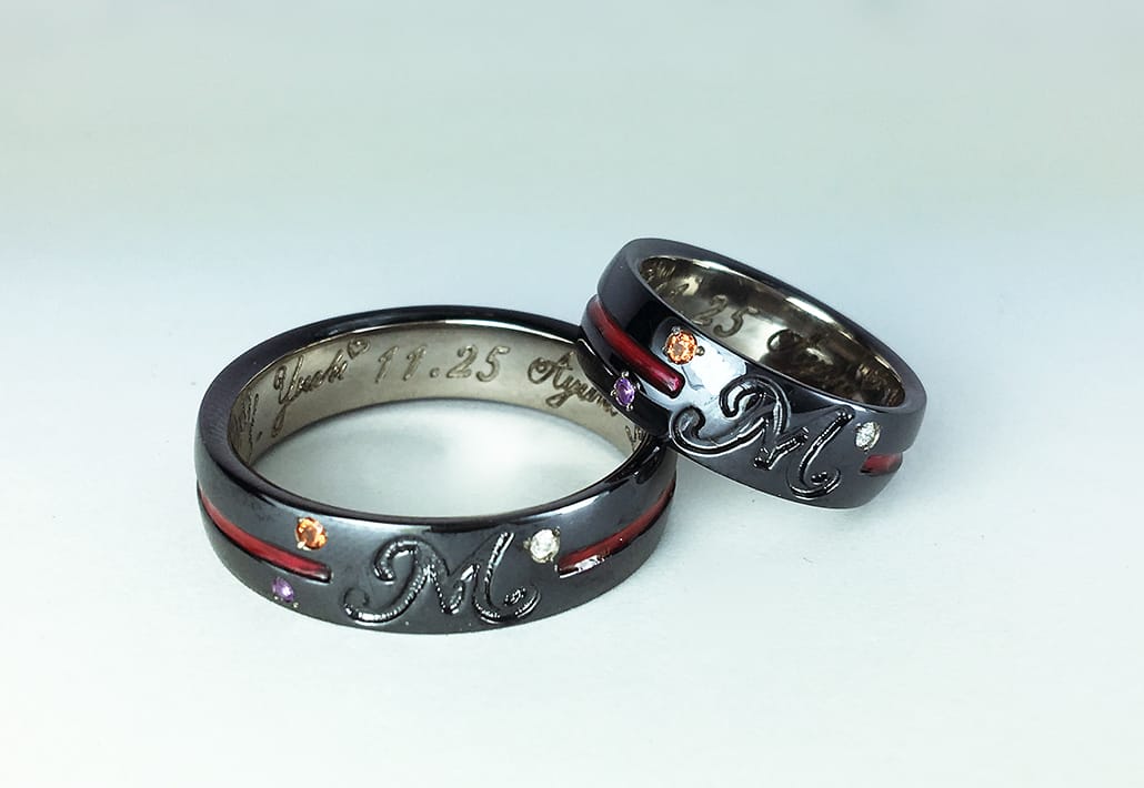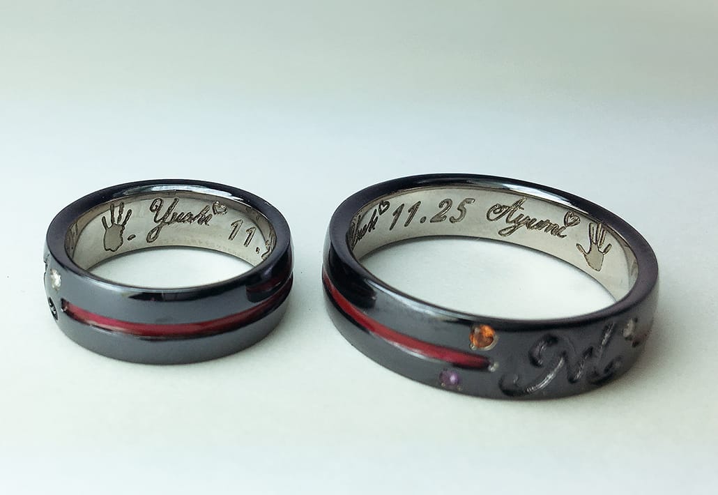 赤いラインとブラックの結婚指輪探しに探して実現しました!