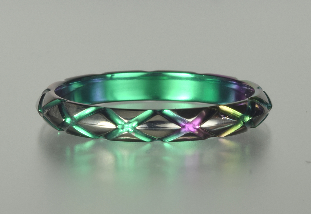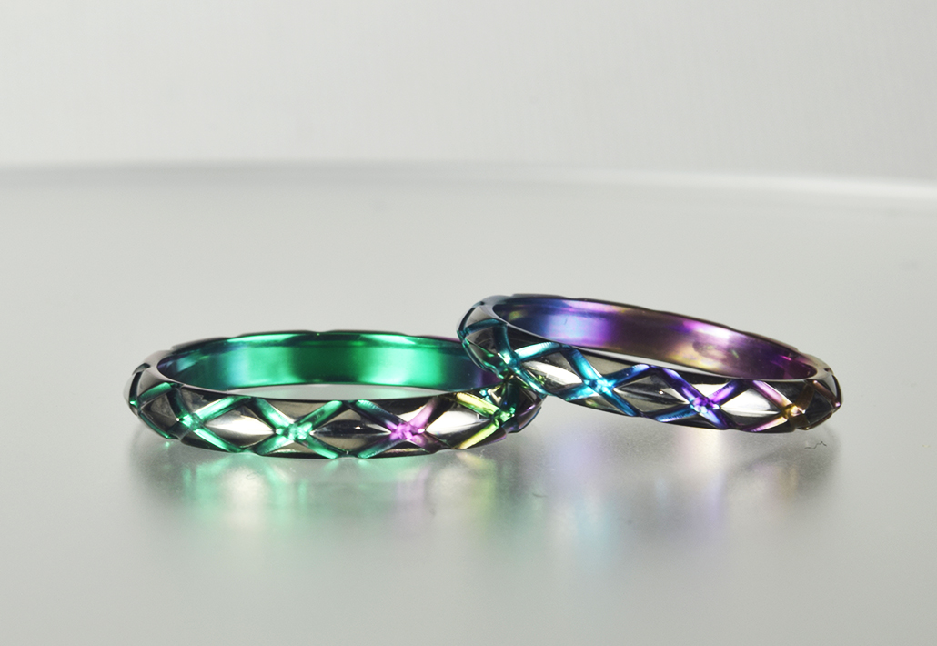 アーガイル<菱形模様>と虹色の発色を組み合わせた結婚指輪は、