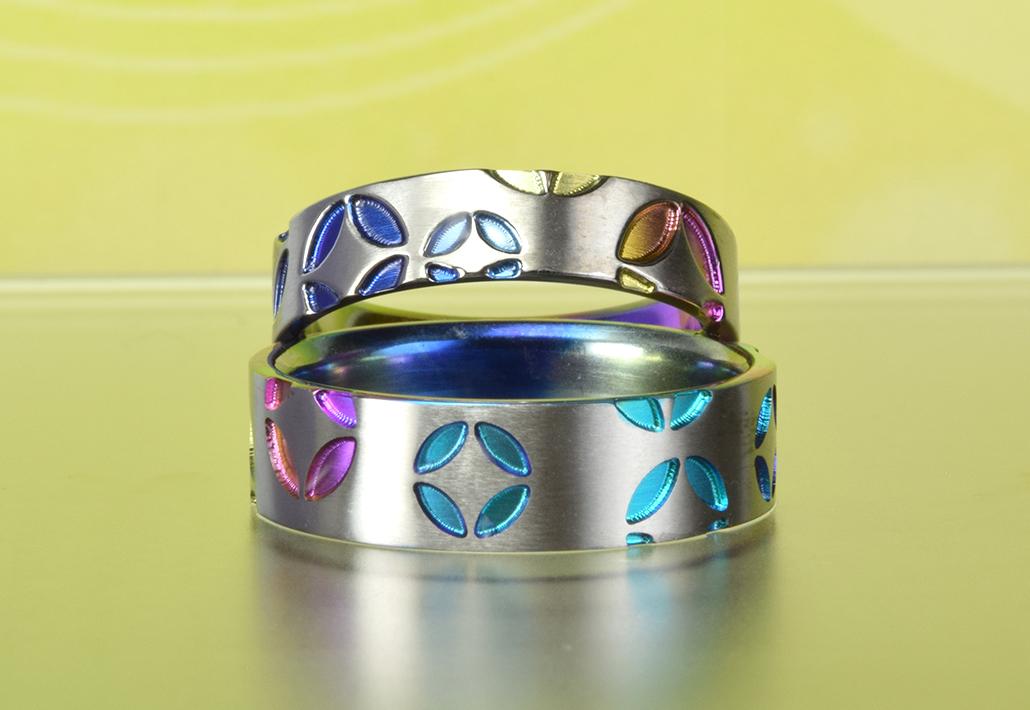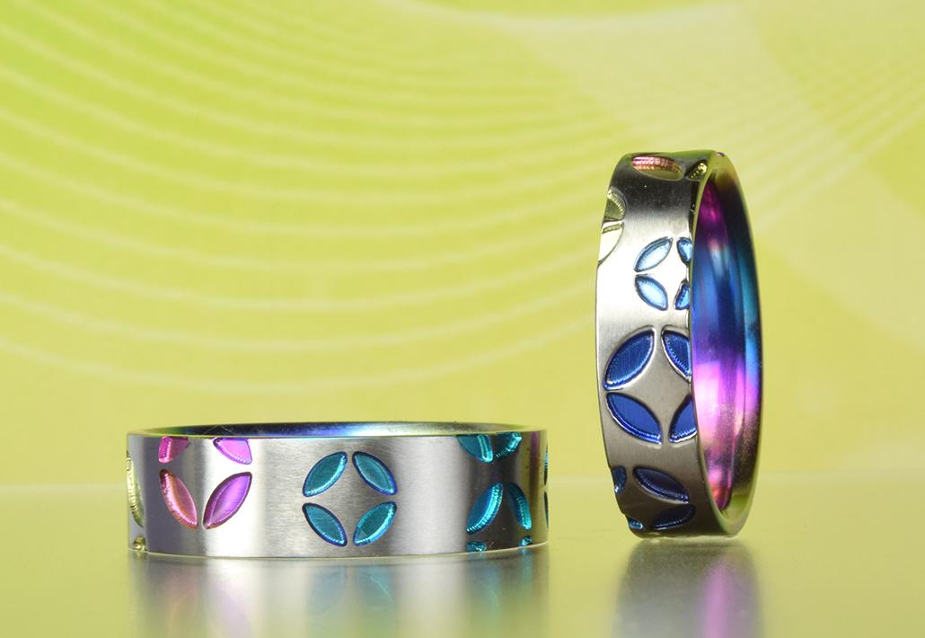 ランダムにあしらった大小の<七宝紋>をチタン、ジルコニウム独特のカラーリングに染め上げた、