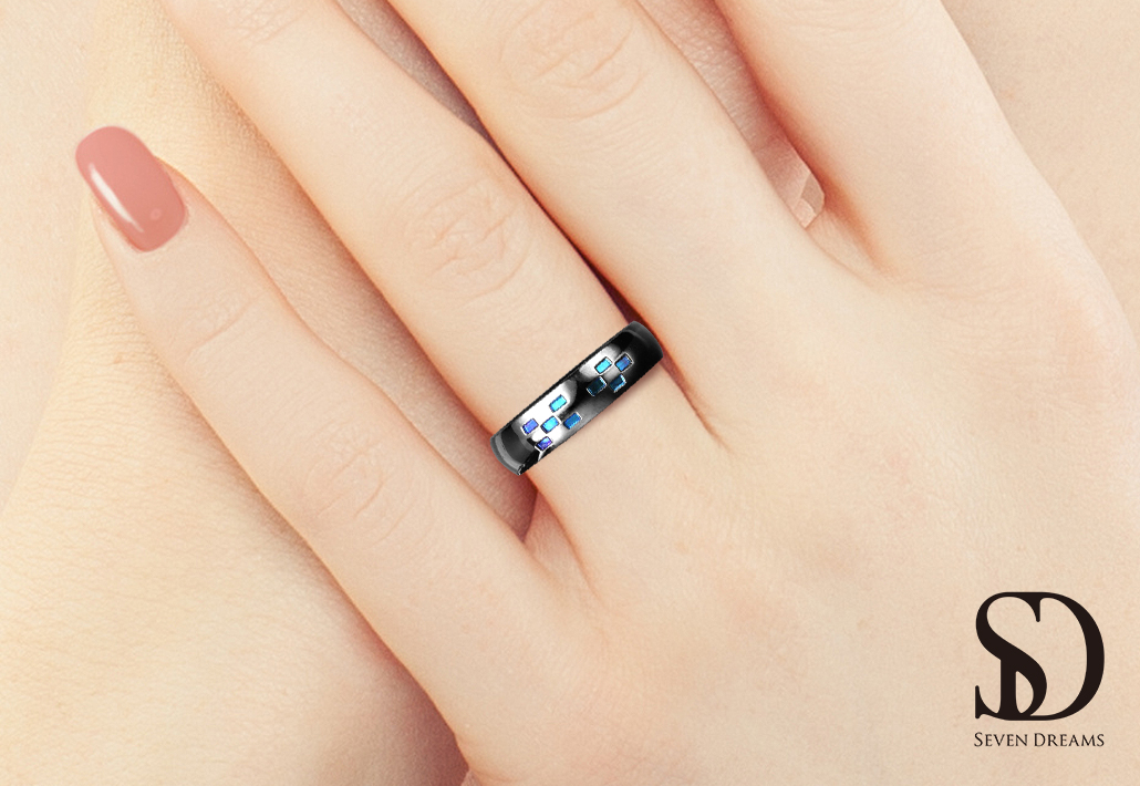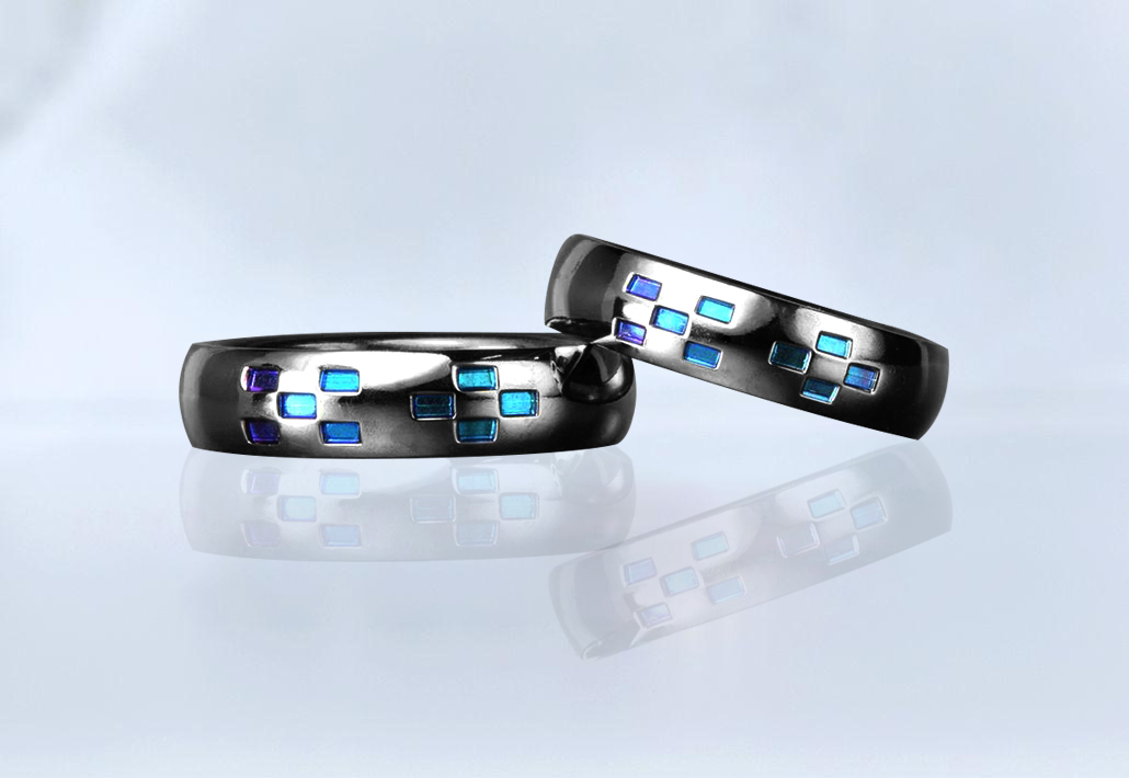 最新|ブラックジルコニウム&青のミンサー結婚指輪|沖縄の伝統文様ミンサーをモチーフにした指輪 <金属アレルギー対応> MG-006-001