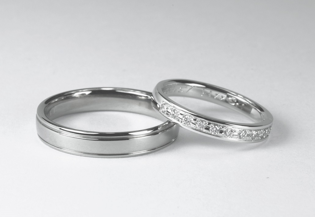 メンズはジルコニウム、レディースもジルコニウムと同じ素材です。デザインは似たものを希望され、シンプルかつお二人だけの唯一無二の結婚指輪が完成いたしました。