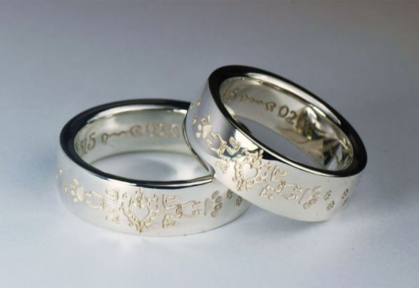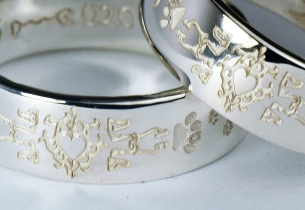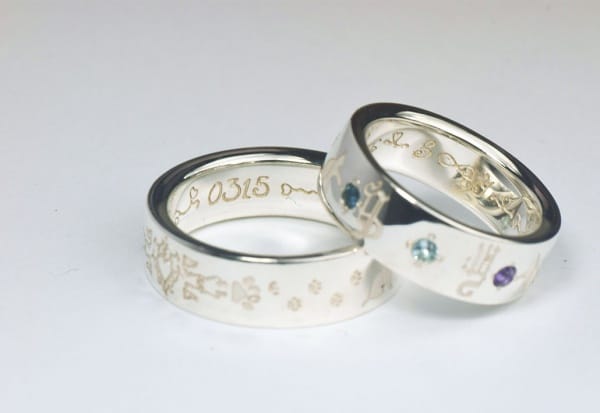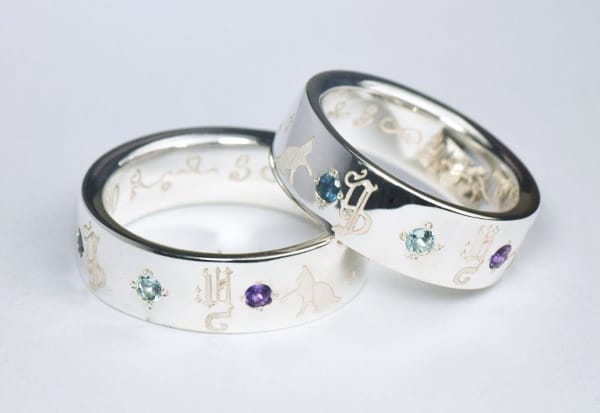 お二人で美容サロンを経営されている仲良しカップルのご希望は、イラストやモノづくりが大好きな御新郎のデザインをマリッジリングにしてみたい!やる気満々のご新郎を見守るご新婦。シルバージュエリーの製作経験もあるという御新郎。早速送られてきたデザインは、やさしさと繊細さが伝わるまさにオンリーワンのスタイル。お二人のシンボルストーンにじゃれる猫、ハートを隠しモチーフにしたイニシャル・・・緻密なデザインを正確にかたちにしていきました。