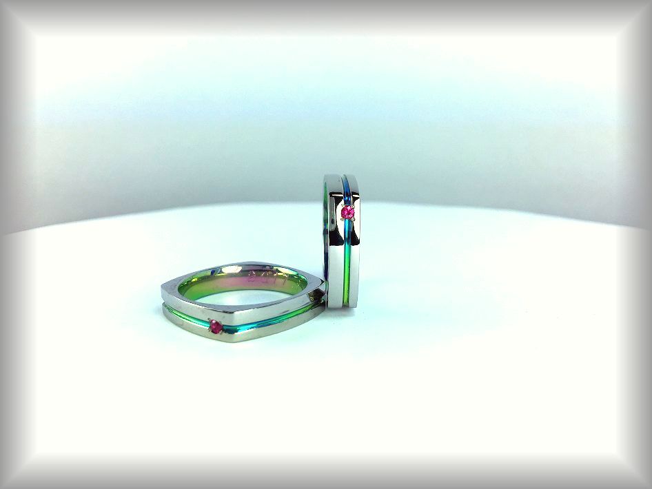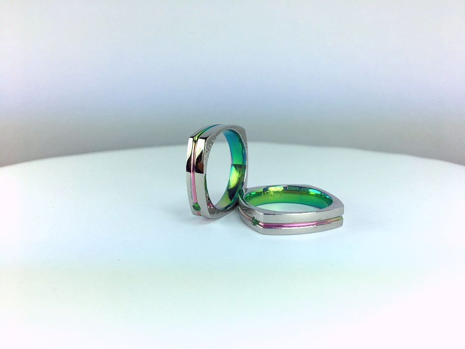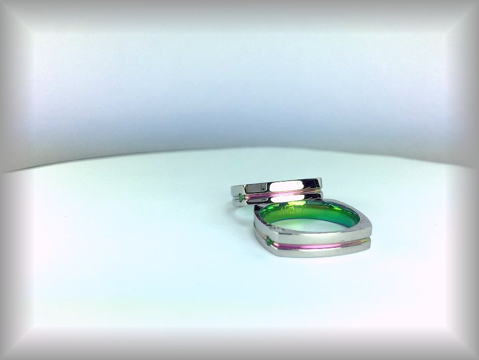 四角のカタチの結婚指輪でチタンで製作。そしてお互いの誕生石を入れいカラーリングは好きな色のグリーンに発色しました。