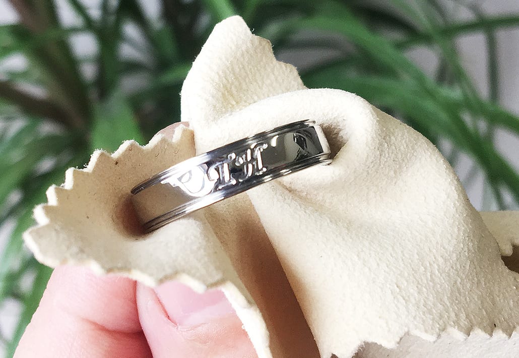 メンズは御新郎のイニシャルを精密に彫りこんだ後、チタンならではのカラーリングを活かして<T=バイオレット><H=ブルー>に発色。二文字がきれいに色分けが決まってスタイリッシュに。書体は何種類か実寸でご提案してイメージを完全に共有してから進行させて頂きました。レディースはチタンのフルエタニティー。細ーいタガネという刃物で小粒のダイヤをひとつひとつ慎重に留めていく作業は、加工が難しい強靭なチタンとの根競べ!?国内でも珍しいチタンのフルエタニティーリングでアレルギーフリーの安心を実現しました。