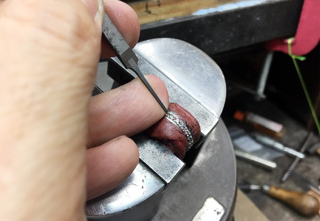 メンズリングの文字の細いところは0.3mm以下・・。限界ぎりぎりの精密さに手に汗握る?!技術が要求される加工にチャレンジ!幸い一回で成功!嬉しくてカラーリング前に一枚撮影!レディースのエタニティーも小さいダイヤをシャープペンの芯ほどの幅の刃物でチタンを彫りこんではダイヤをセット。。の繰り返し。乱れなく綺麗なダイヤの並びが美しさのポイント。2本とも精密さが最高に要求されるリング作りを乗り切った達成感は格別!?でした(⌒-⌒)