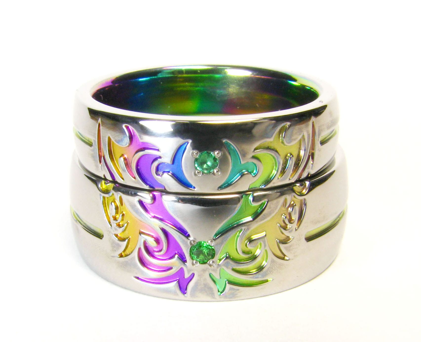 チタン独特の発色が、虹色に燃え上がるファイアパターンを演出するインパクトあるマリッジに!