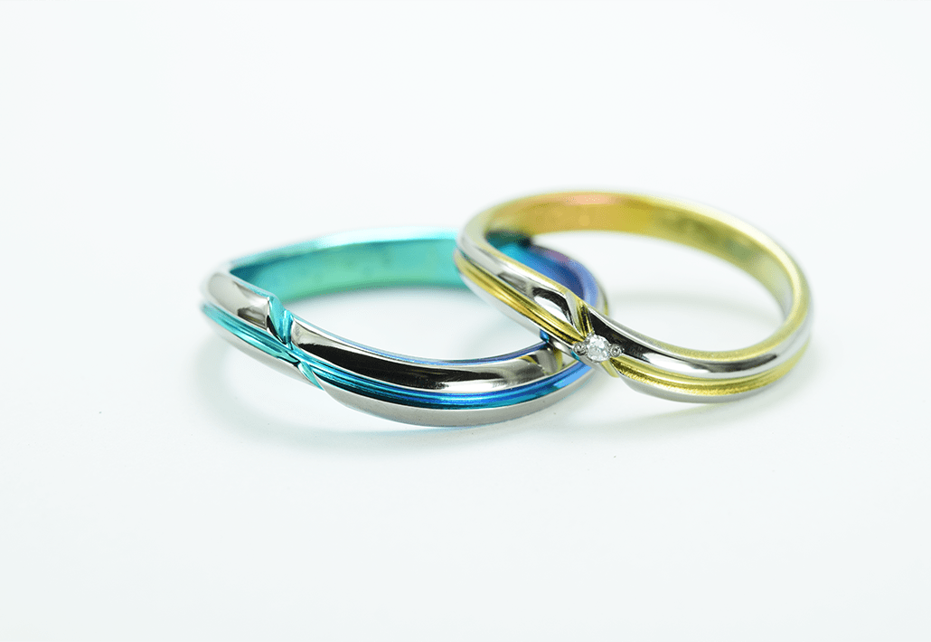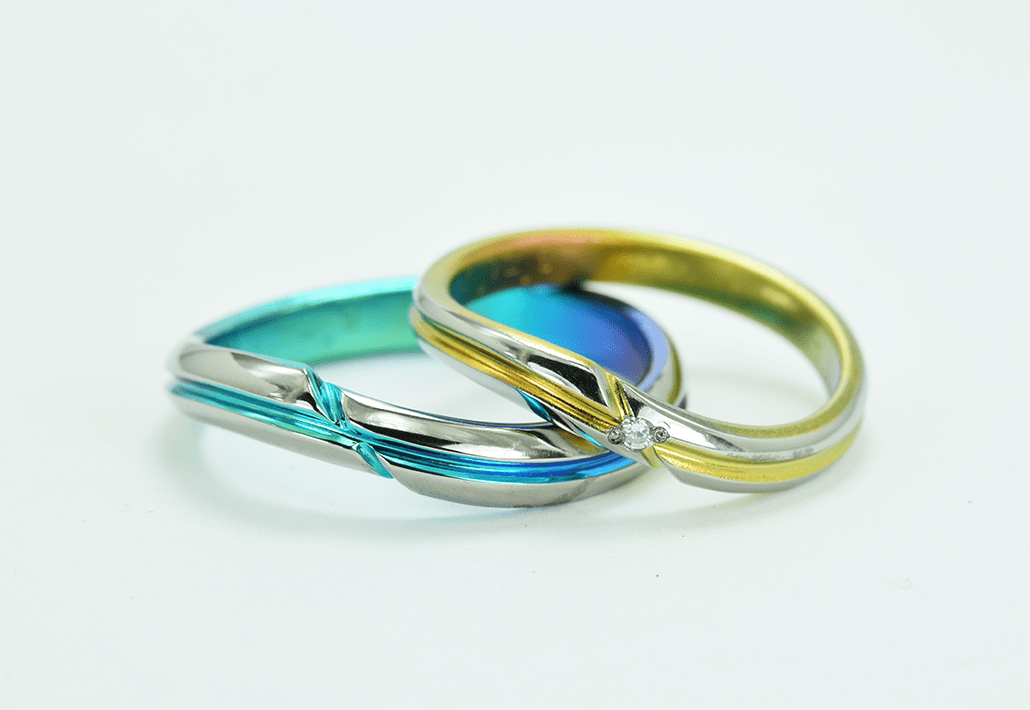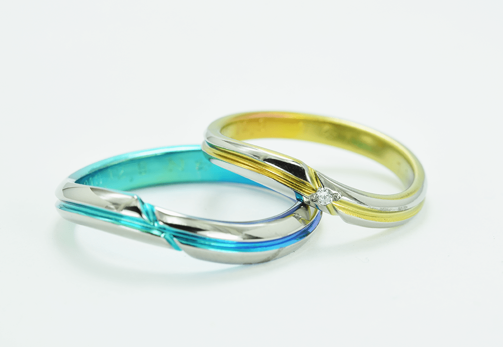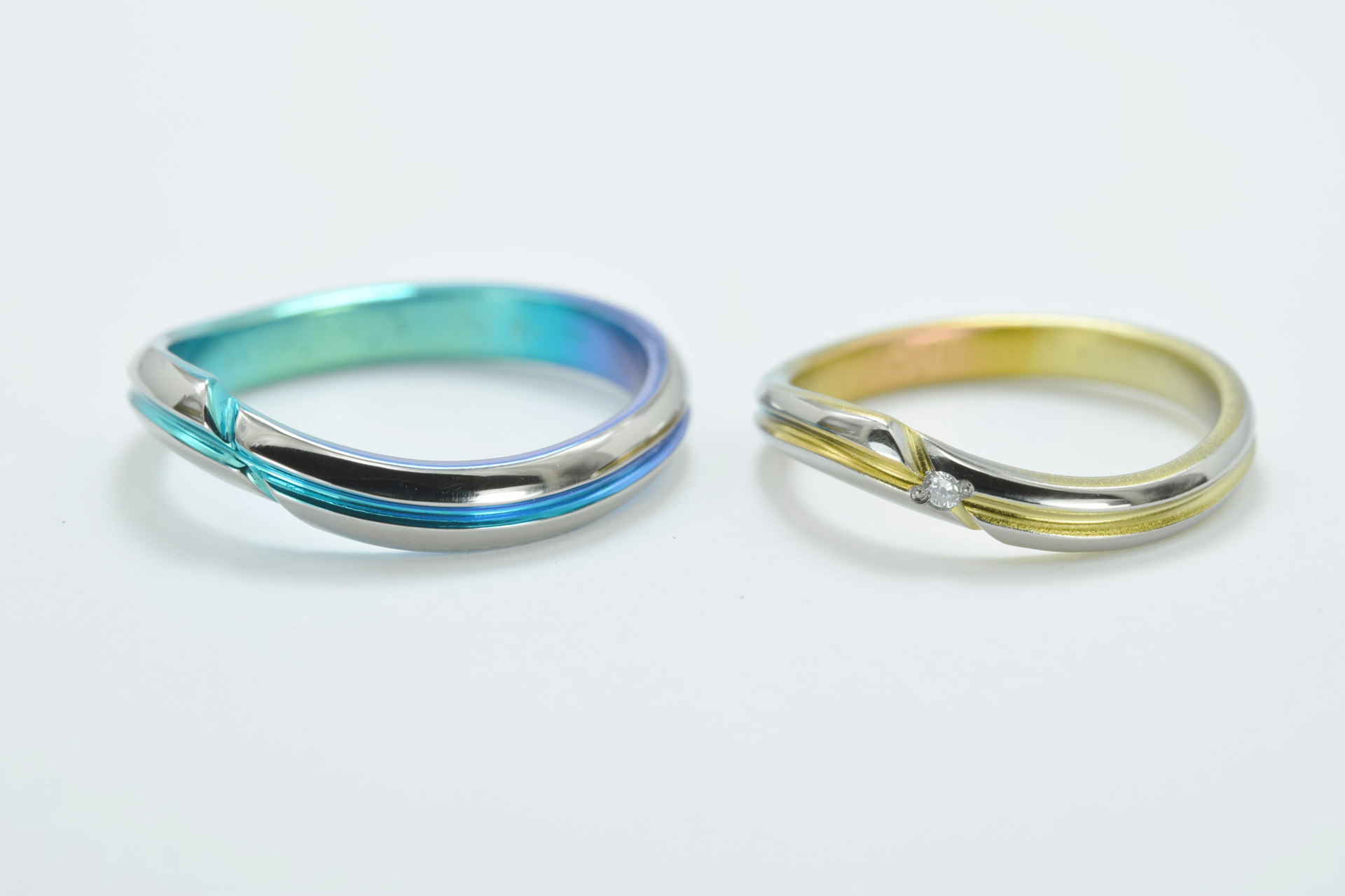 金属アレルギーがあるので、アレルギー対策の結婚指輪を探していたお二人のご来店。お打ち合わせはスイスイと進み、お気に入りのデザインに好みのカラーリングをそれぞれチョイス。メンズはエメラルドグリーンからブルーの鮮烈なグラデーション。レディースはイエロー~ピンクの華やかな彩り。手のひらがわには、お二人だけのマークを分割して彫刻。バイオレットに発色がきれいに決まりました。