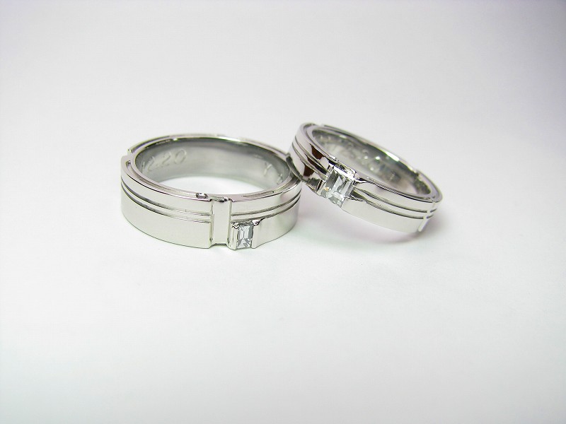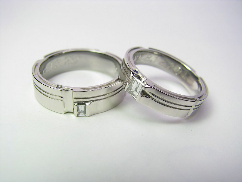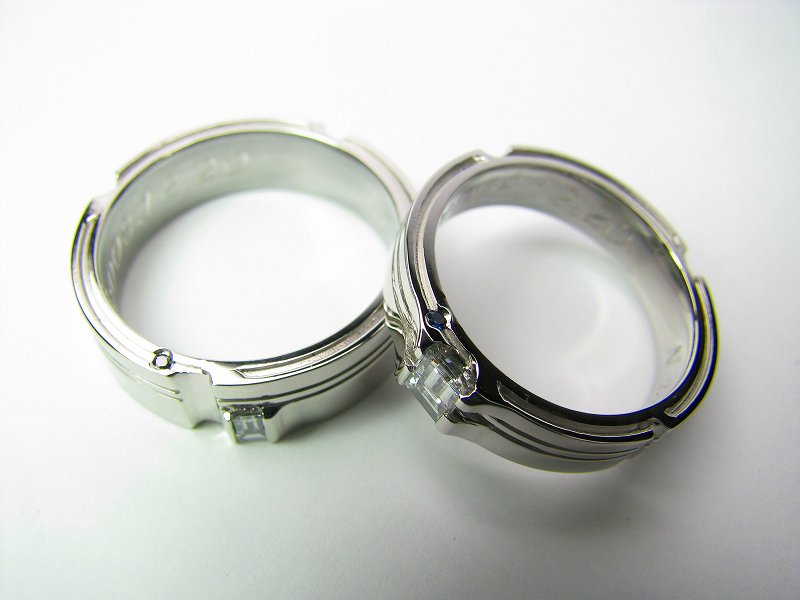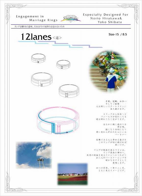 ヒアリングの中、ご新郎が高校時代人生を賭けた、陸上部のランナーだった時のエピソードにインスピレーションを頂いて作られた結婚指輪です。バトンを繋ぐということにランナーそれぞれがこんなにも命を燃やしている事、仲間の信頼にこたえるために積み重ねる努力、献身・・。つなぐバトンの繰り返しが、お二人で支えあいながら歩む未来への道のりのイメージに重なって見えました。リングのフチを片面から、反対側のフチへ、またもとのフチへ・・。繋がっていくラインがお二人でつないでゆく信頼と支えあいのバトン、進んでゆくレーン(道)を表現しています。