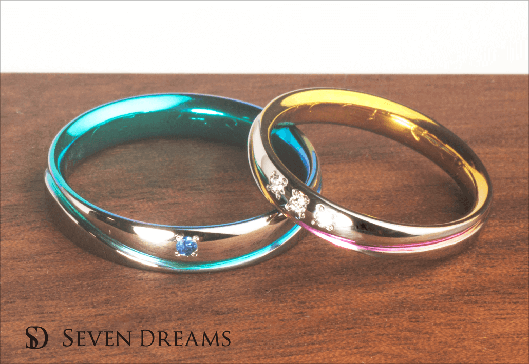 純チタンはウエーブに加工するのは難しくしかもそのラインに沿ってラインを描くのは至難の技です。今回ご依頼を受けて綺麗に仕上げるための器具から製作し取り組みました。チタンのカラーリングは124色ある色の中で二人だけの色を出す事が出来ます。お二人色に染めてください。