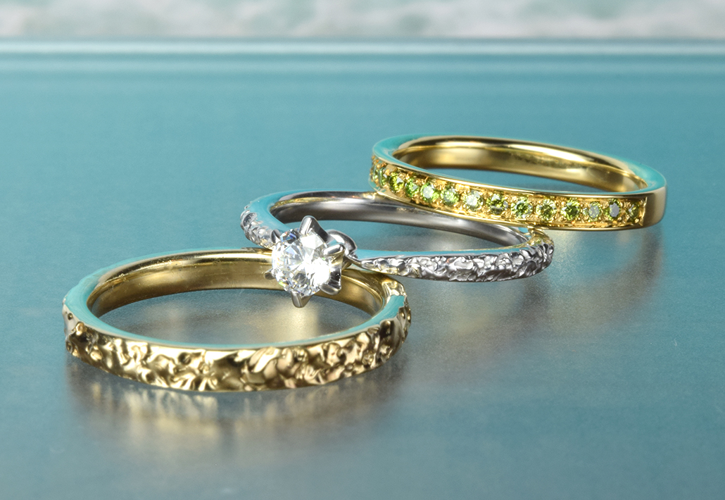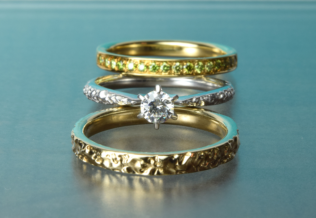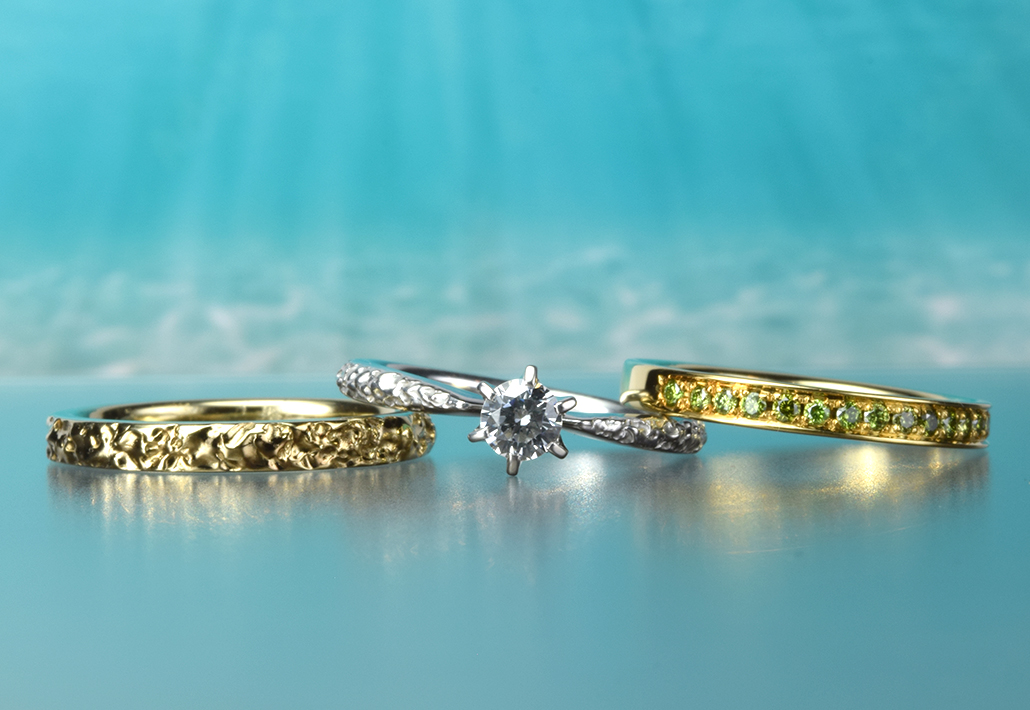 お二人のリングを、安心感を触れる指先に伝えてくれる存在にしてみたい。そんな願いが発展して生まれたのがこのリングなんです。