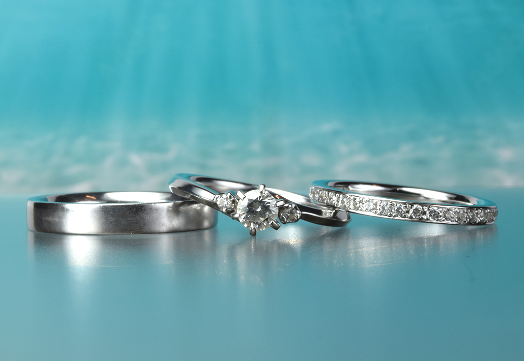 シンプルなソリテールに、レディースはハーフエタニティーでゴージャスに。