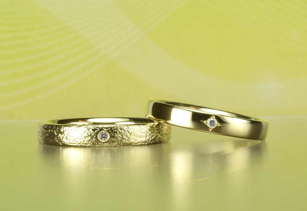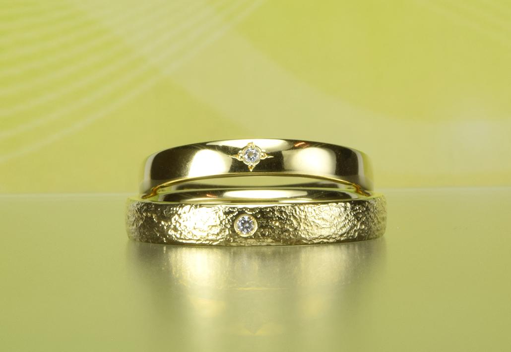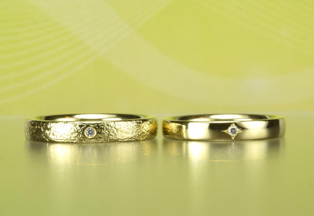 K18グリーンゴールドの結婚指輪(マリッジ)石目仕上げのメンズとスターセッテイングがポイントMG-122